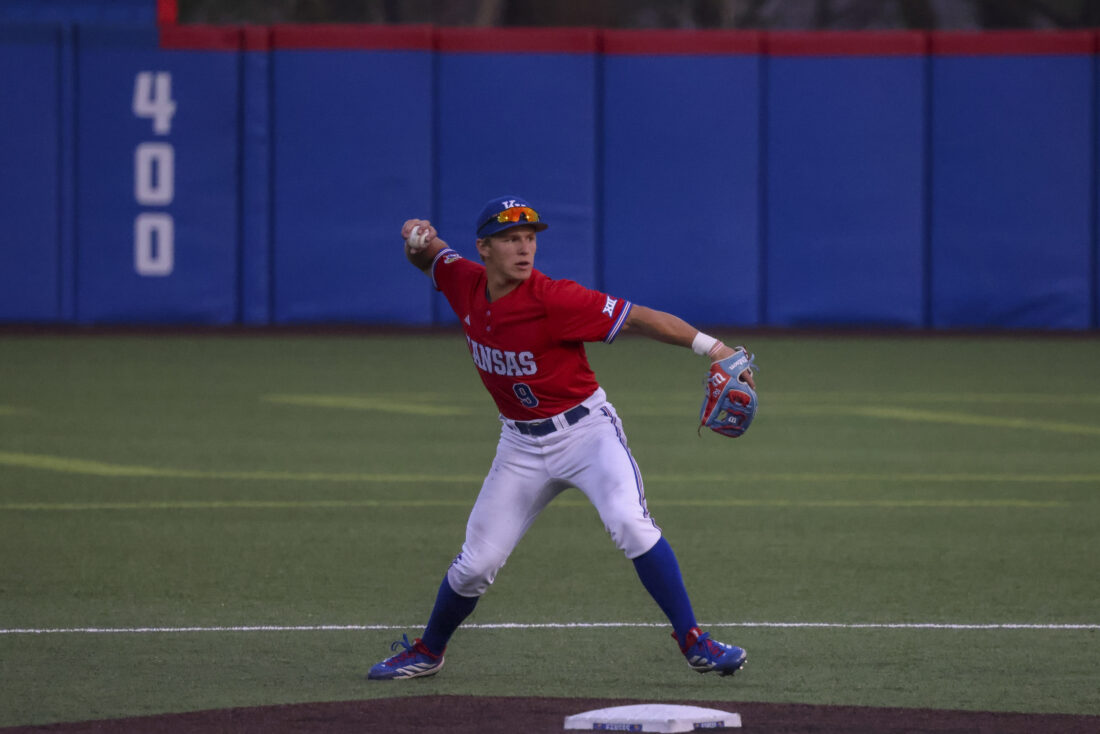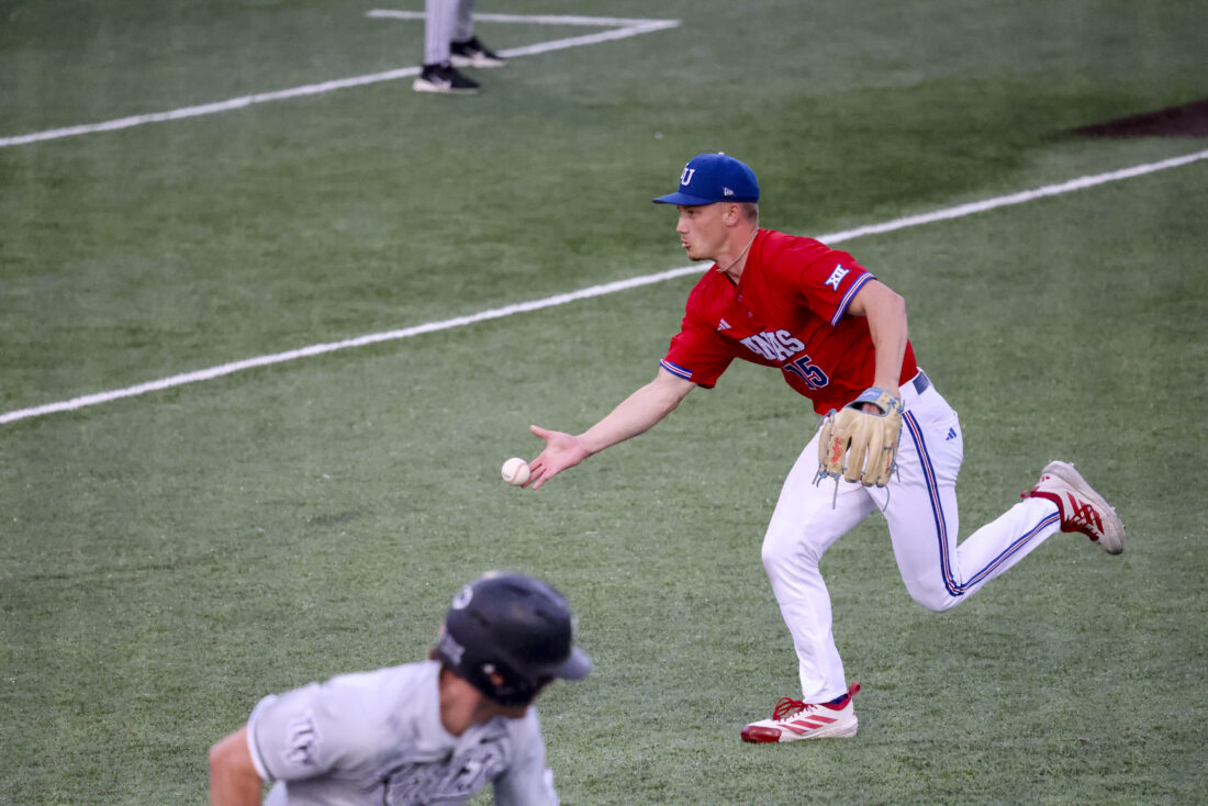 Kansas second baseman Cade Baldridge makes the throw to first to complete a play during game two of the Jayhawks’ doubleheader against UCF on Saturday, April 11, 2026, at Hoglund Ballpark in Lawrence.