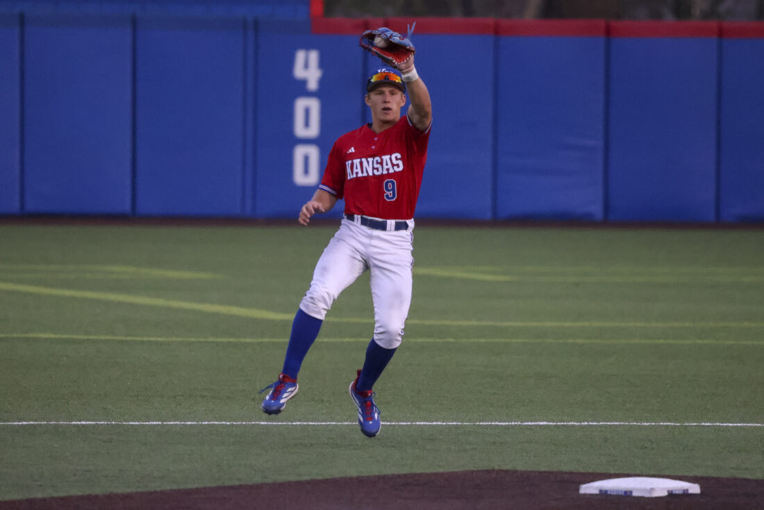 Kansas first baseman Josh Dykhoff catches a pop fly in foul territory during game two of the Jayhawks’ doubleheader against UCF on Saturday, April 11, 2026, at Hoglund Ballpark in Lawrence.