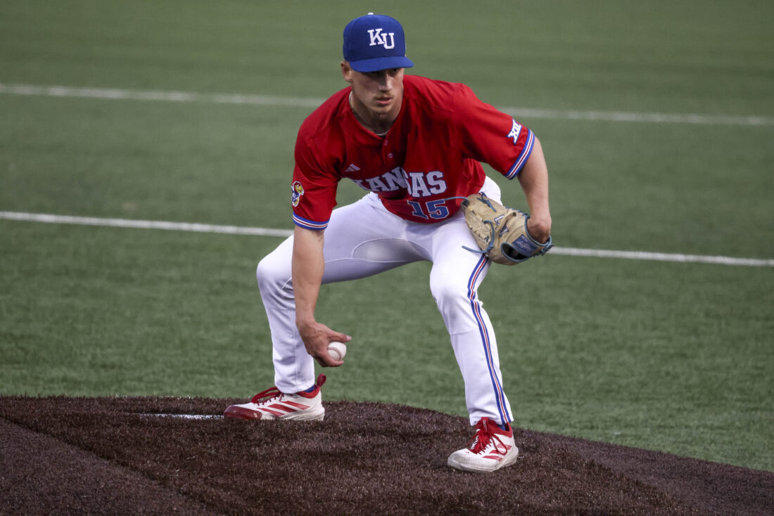 Kansas pitcher Boede Rahe looks to start his windup during game two of the Jayhawks’ doubleheader against UCF on Saturday, April 11, 2026, at Hoglund Ballpark in Lawrence.