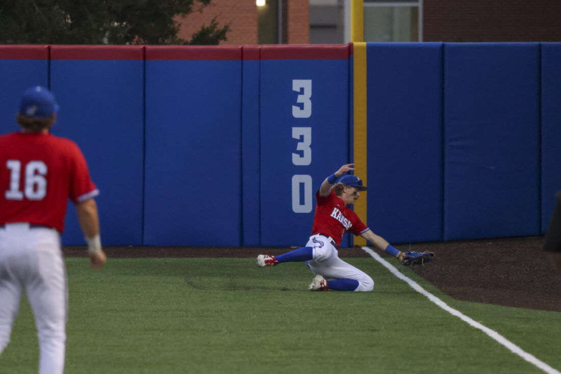 Kansas right fielder Jordan Bach slides after completing a catch during game two of the Jayhawks’ doubleheader against UCF on Saturday, April 11, 2026, at Hoglund Ballpark in Lawrence.