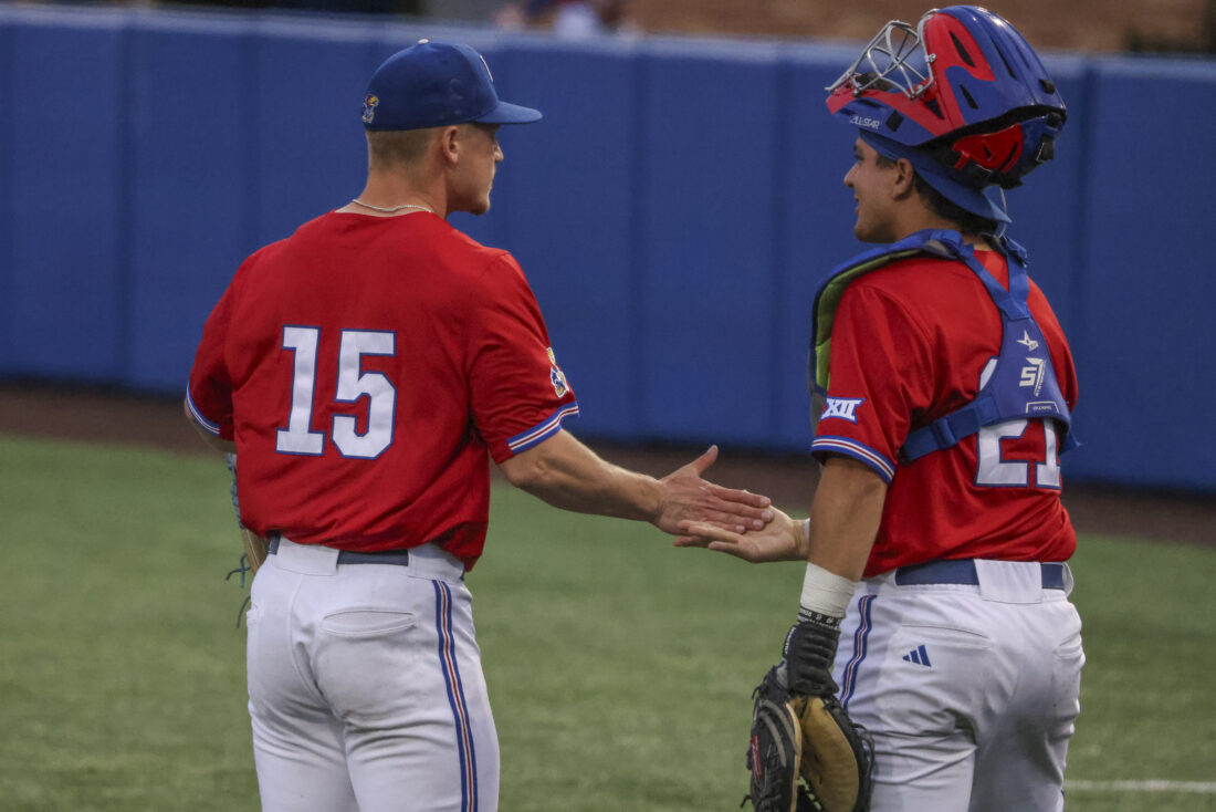Kansas pitcher Toby Scheidt and catcher Augusto Mungarrieta high -five after closing out an inning during game two of the Jayhawks’ doubleheader against UCF on Saturday, April 11, 2026, at Hoglund Ballpark in Lawrence.