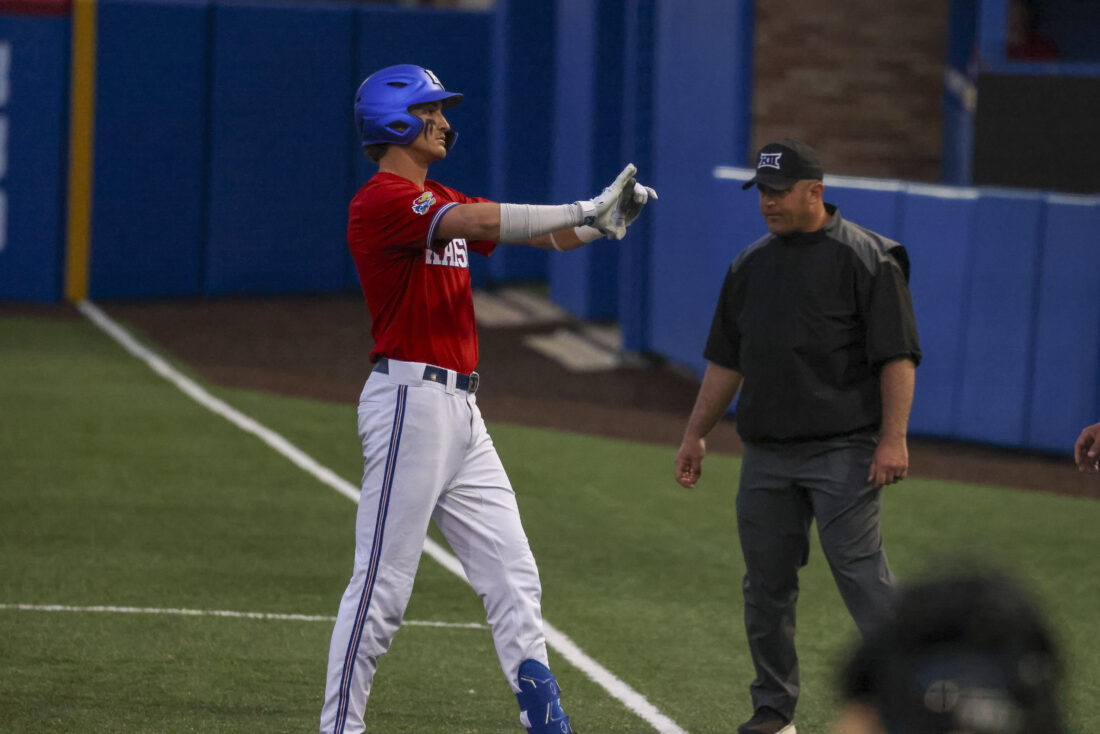 Kansas designated hitter Max Soliz Jr. celebrates with the dugout after recording a hit during game two of the Jayhawks’ doubleheader against UCF on Saturday, April 11, 2026, at Hoglund Ballpark in Lawrence.