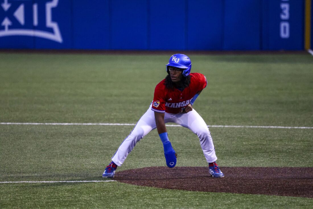 Kansas pinch runner Savion Flowers takes a lead off first base during game two of the Jayhawks’ doubleheader against UCF on Saturday, April 11, 2026, at Hoglund Ballpark in Lawrence.