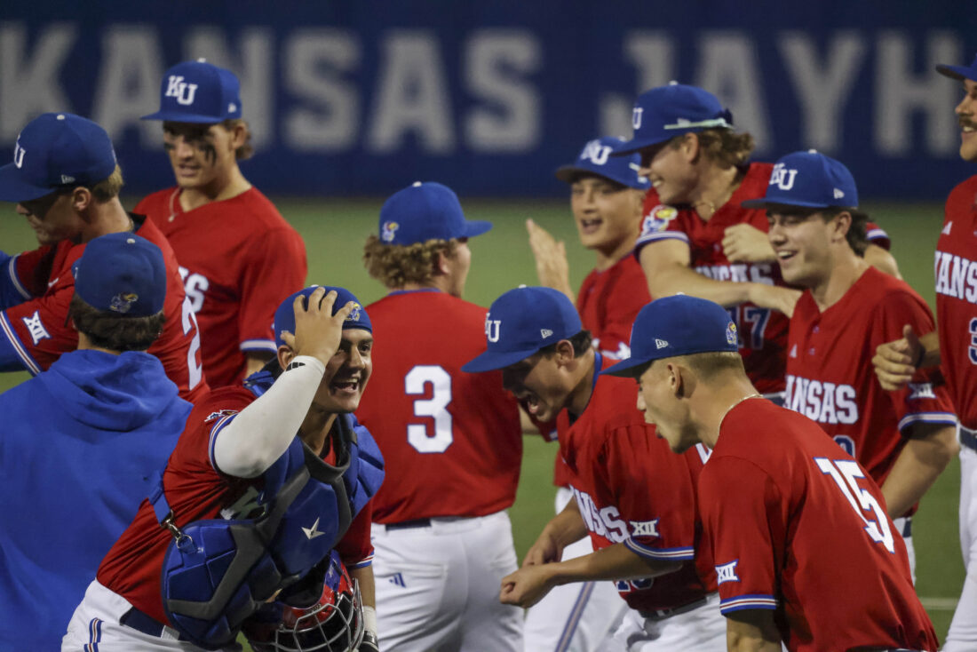 The Kansas baseball team celebrates its series sweep over UCF on Saturday, April 11, 2026, at Hoglund Ballpark in Lawrence.