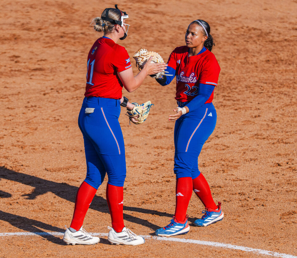 Kansas pitcher Lizzy Ludwig and infielder Anna Soles give high fives after an out during the game against Missouri on Wednesday, April 15, 2026, in Lawrence.