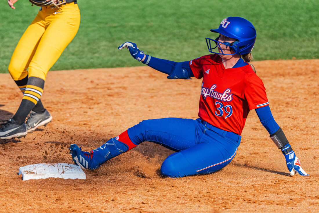 Kansas outfielder Aynslee Linduff slides into second base during the game against Missouri on Wednesday, April 15, 2026, in Lawrence.