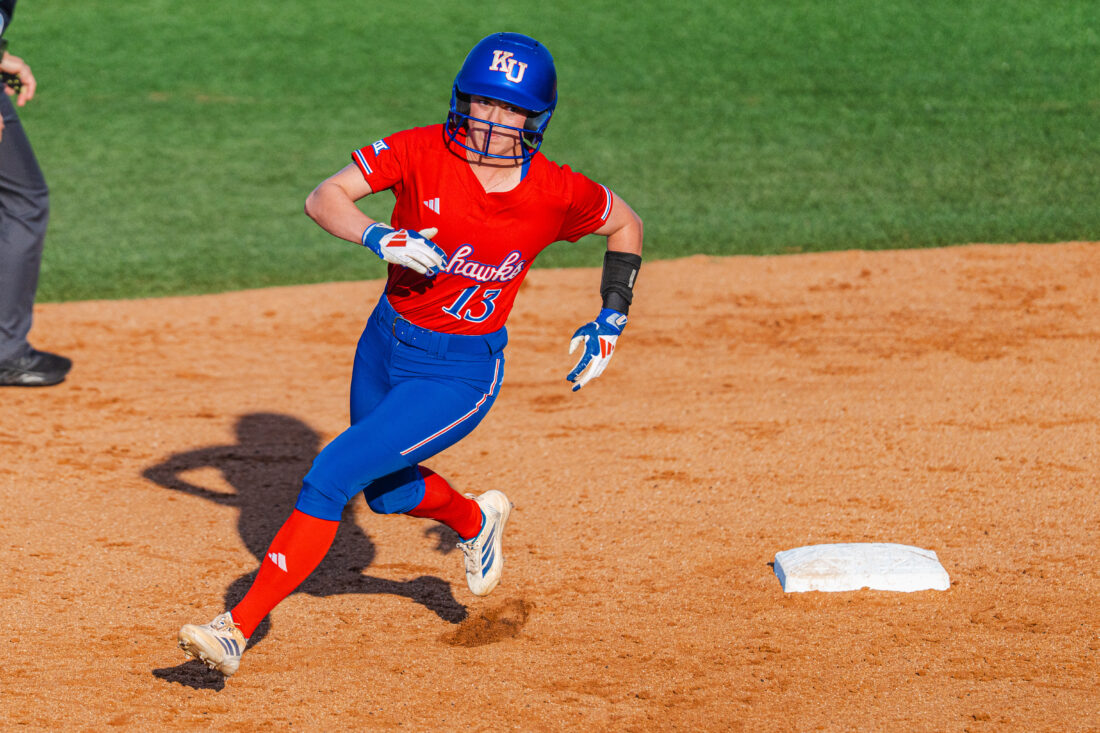 Kansas outfielder Bailey Weber rounds second base during the game against Missouri on Wednesday, April 15, 2026, in Lawrence.