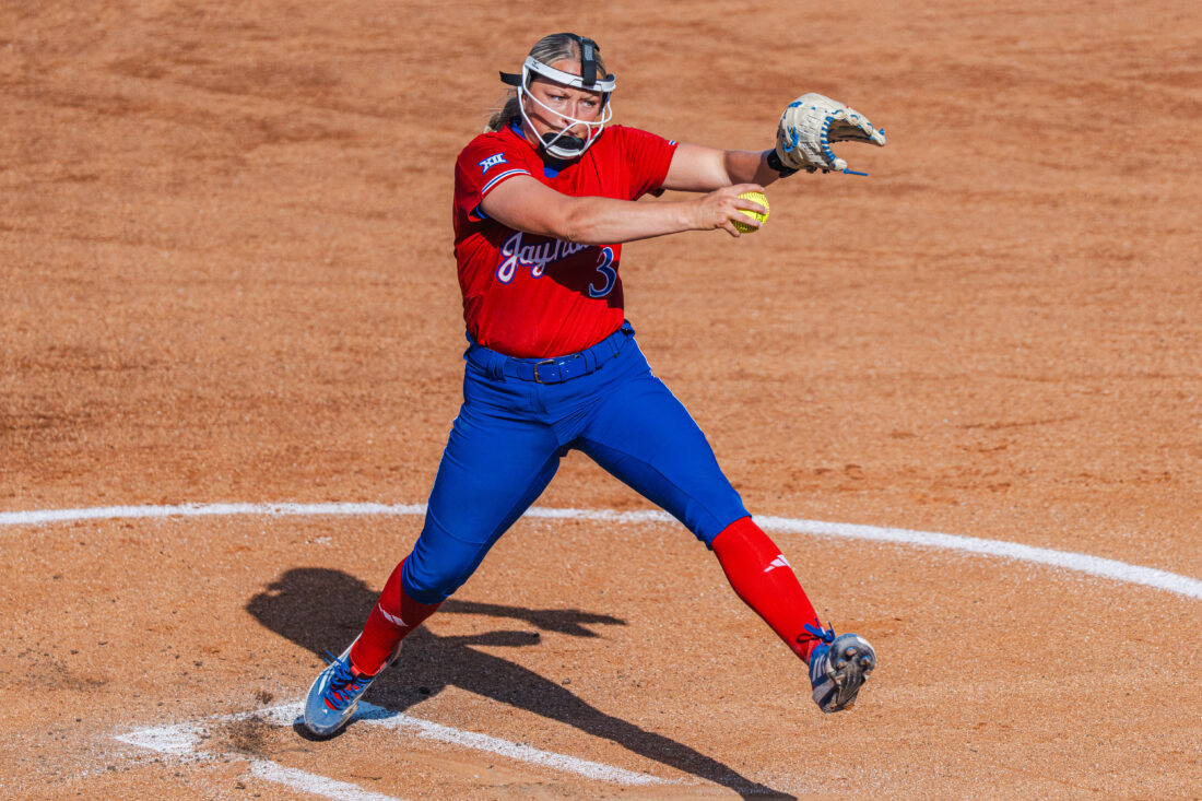 Kansas pitcher Blakely Barber delivers a pitch during the game against Missouri on Wednesday, April 15, 2026, in Lawrence.