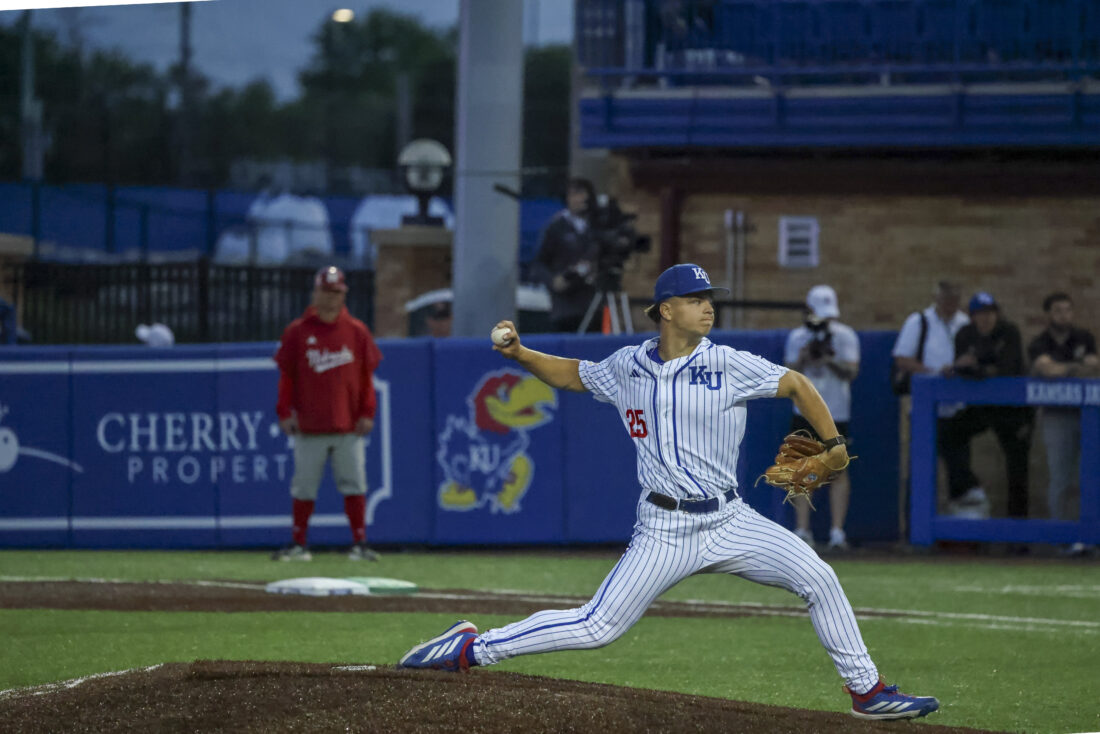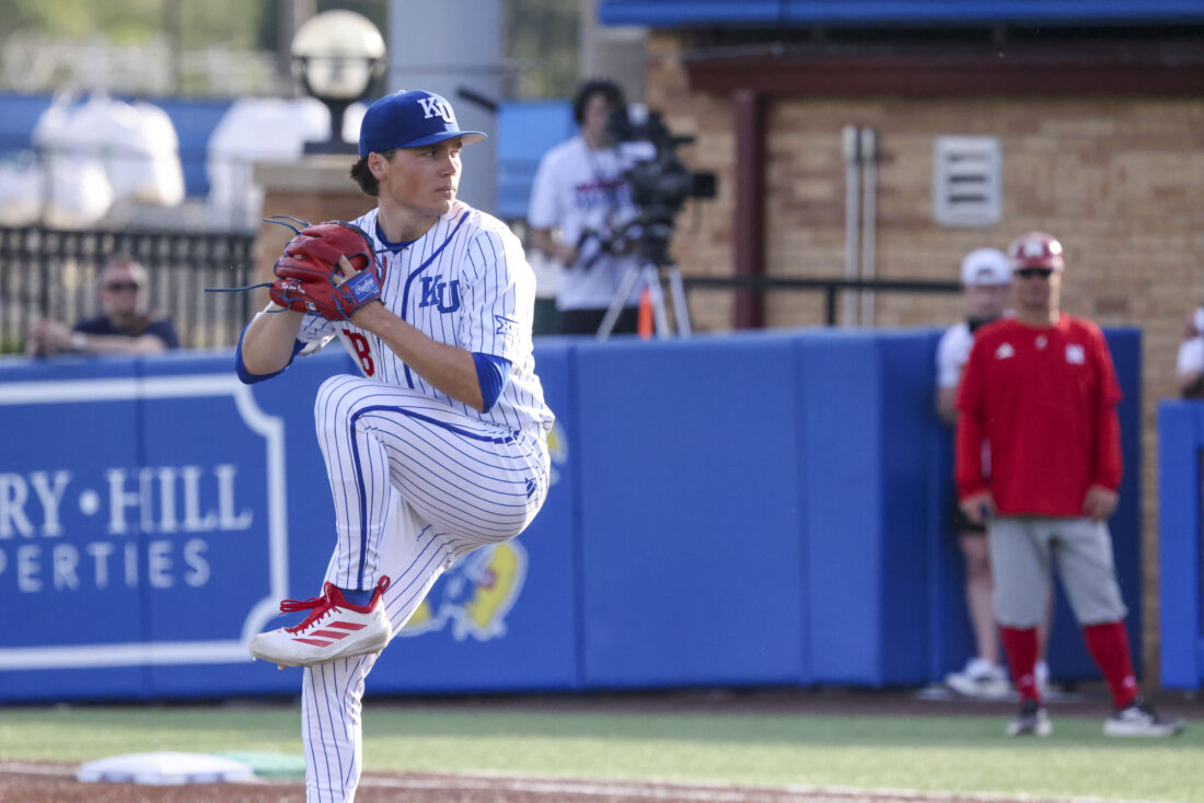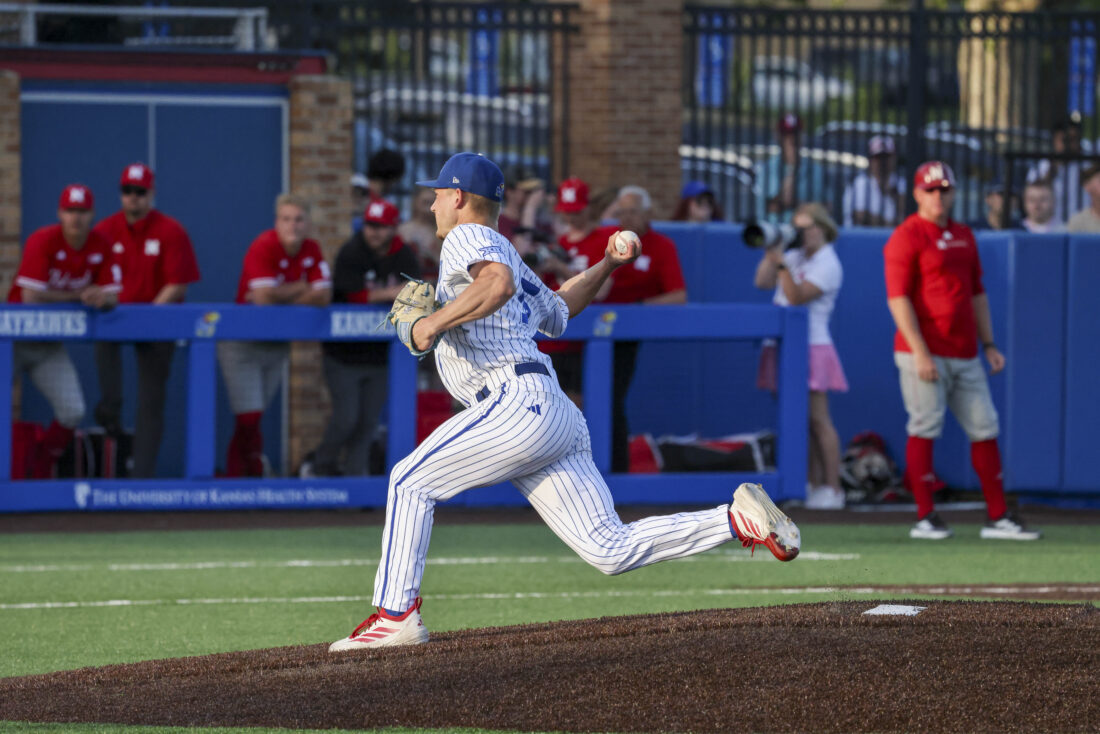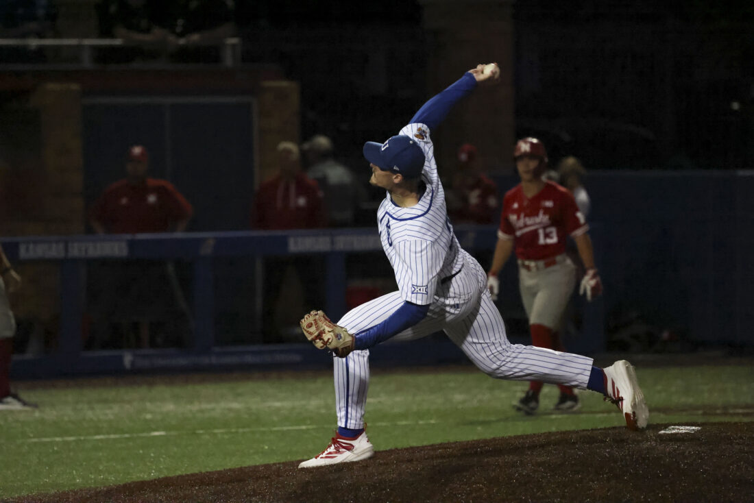 Kansas pitcher Boede Rahe delivers a pitch during the Jayhawks’ game against Nebraska on Tuesday, April 21, 2026, at Hoglund Ballpark in Lawrence.