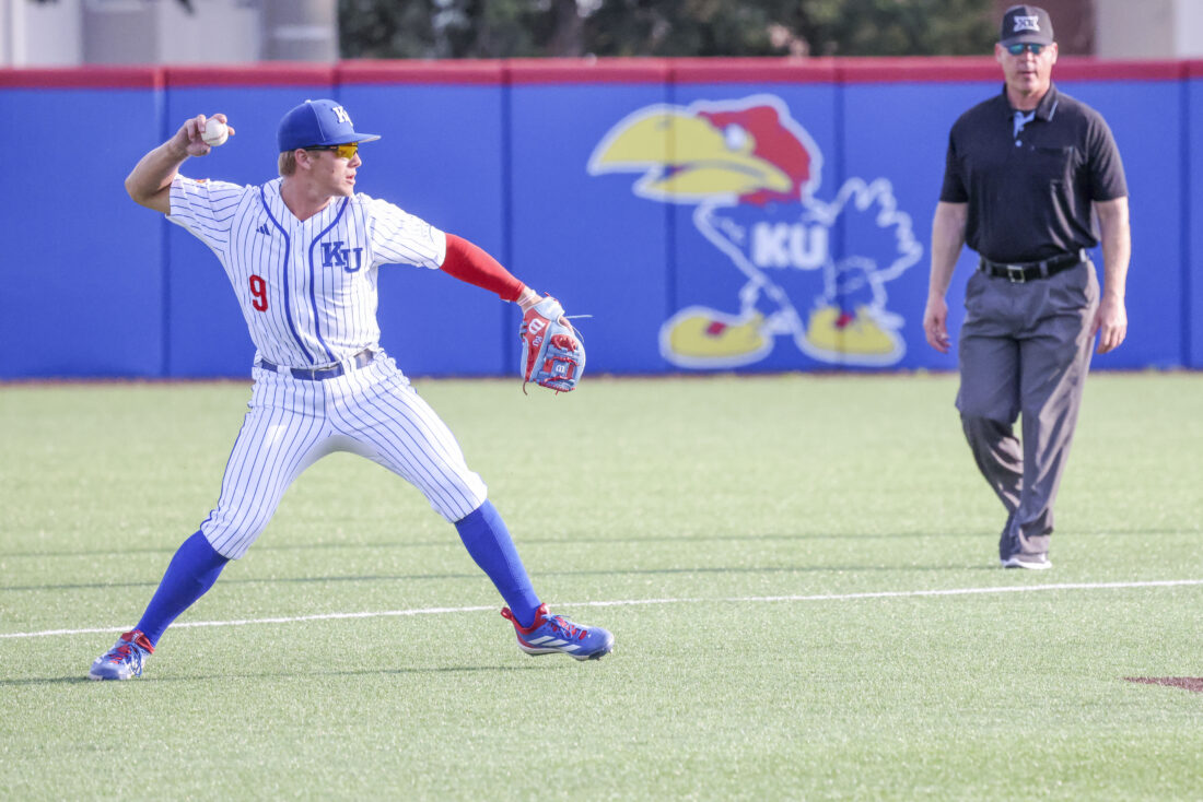 Kansas third baseman Dylan Schlotterback goes to throw over to first during the Jayhawks’ game against Nebraska on Tuesday, April 21, 2026, at Hoglund Ballpark in Lawrence.