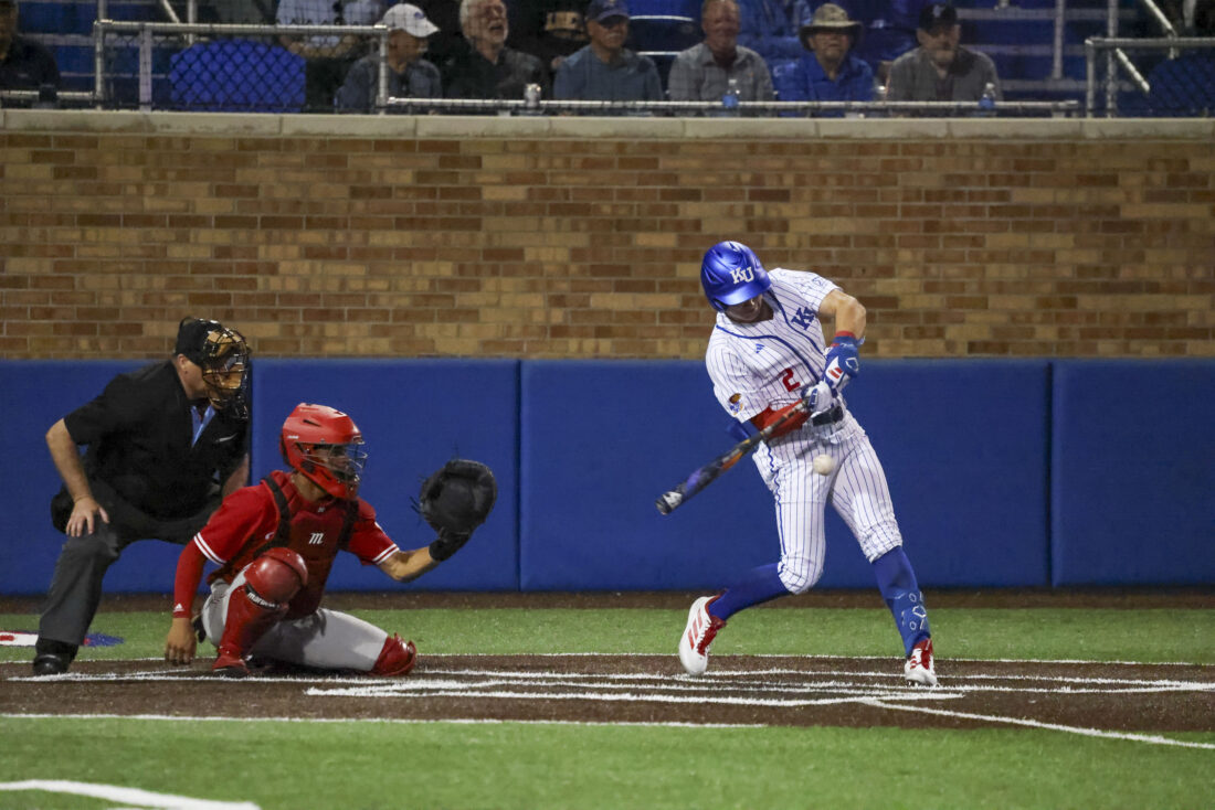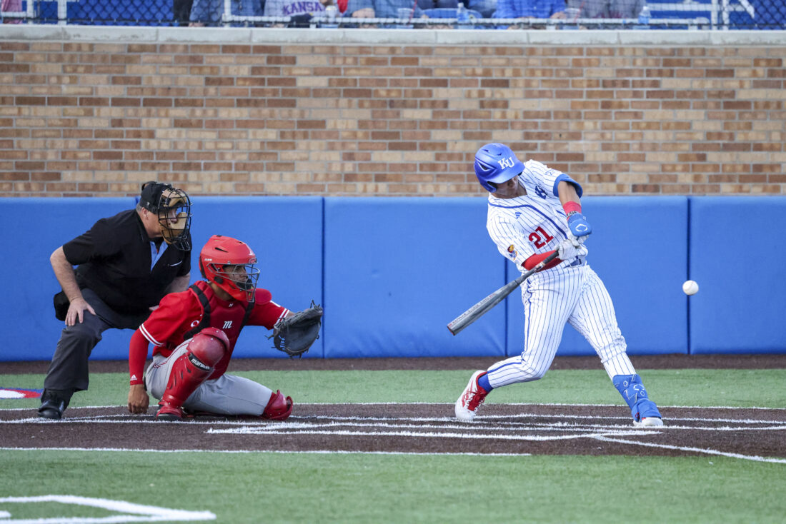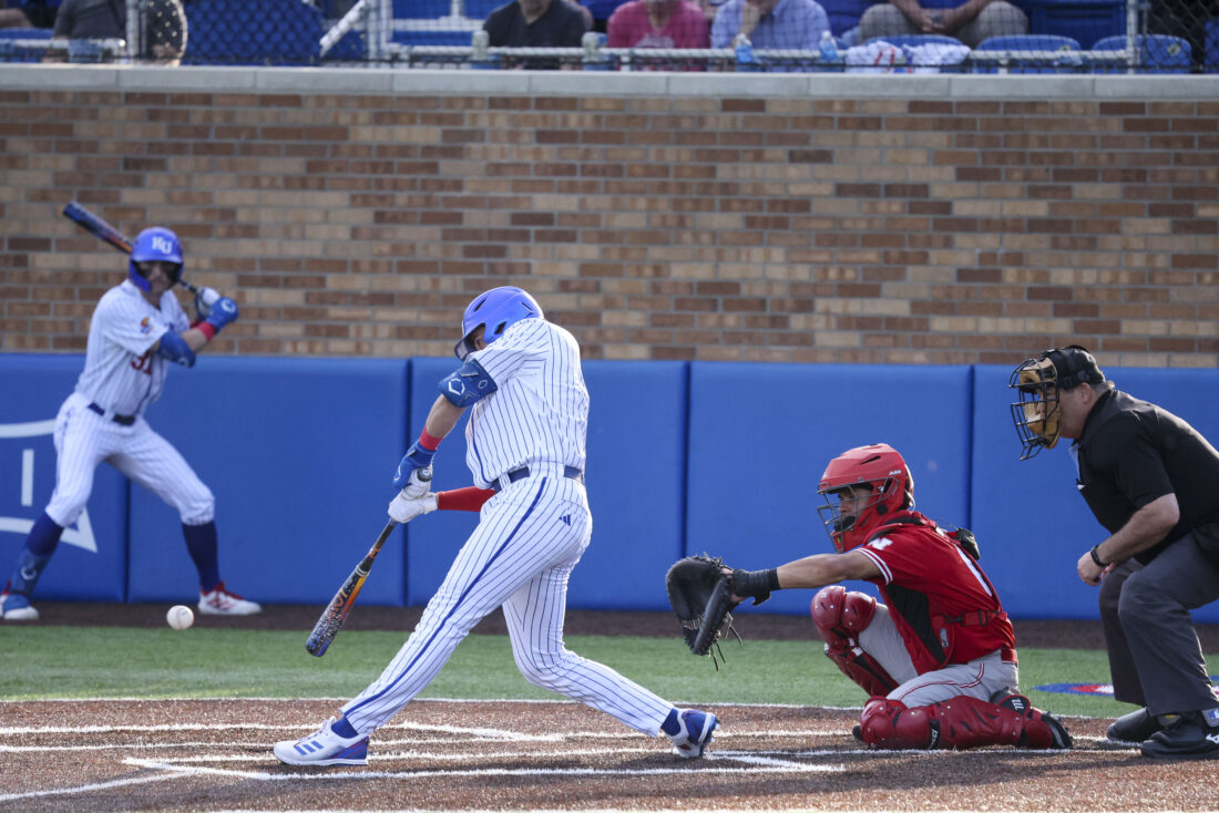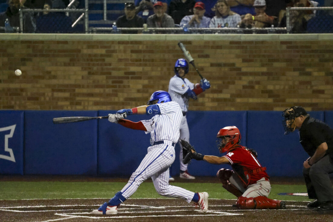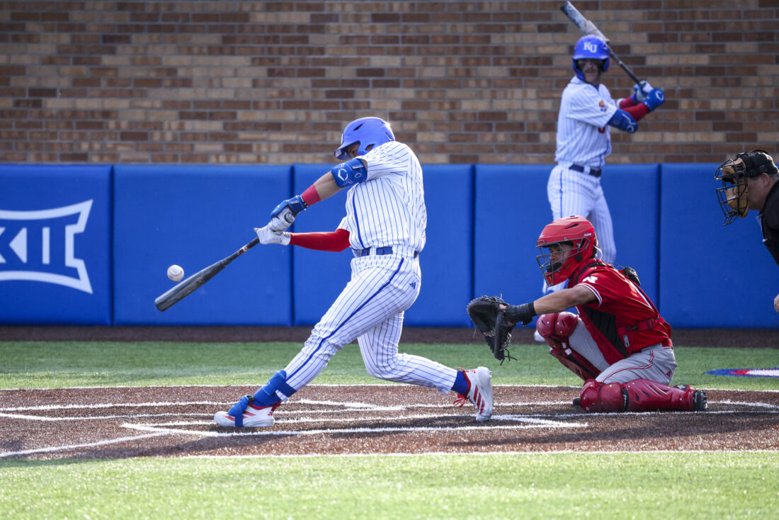 Kansas junior Cade Baldridge makes contact during the Jayhawks’ game against Nebraska on Tuesday, April 21, 2026, at Hoglund Ballpark in Lawrence.