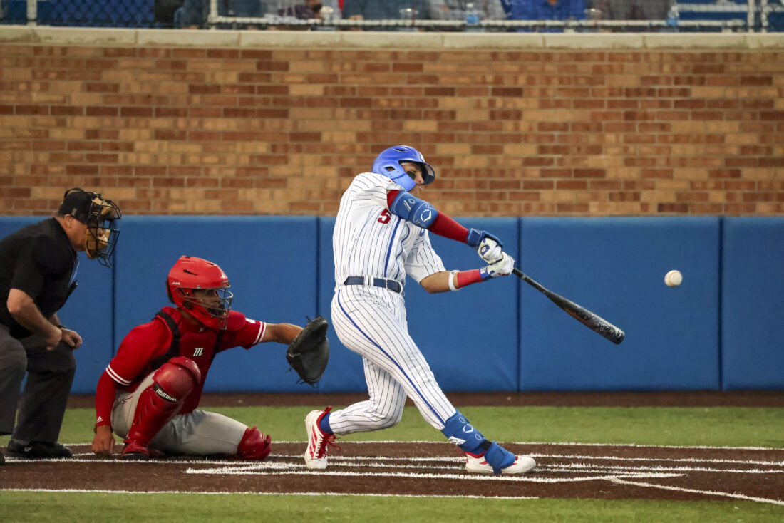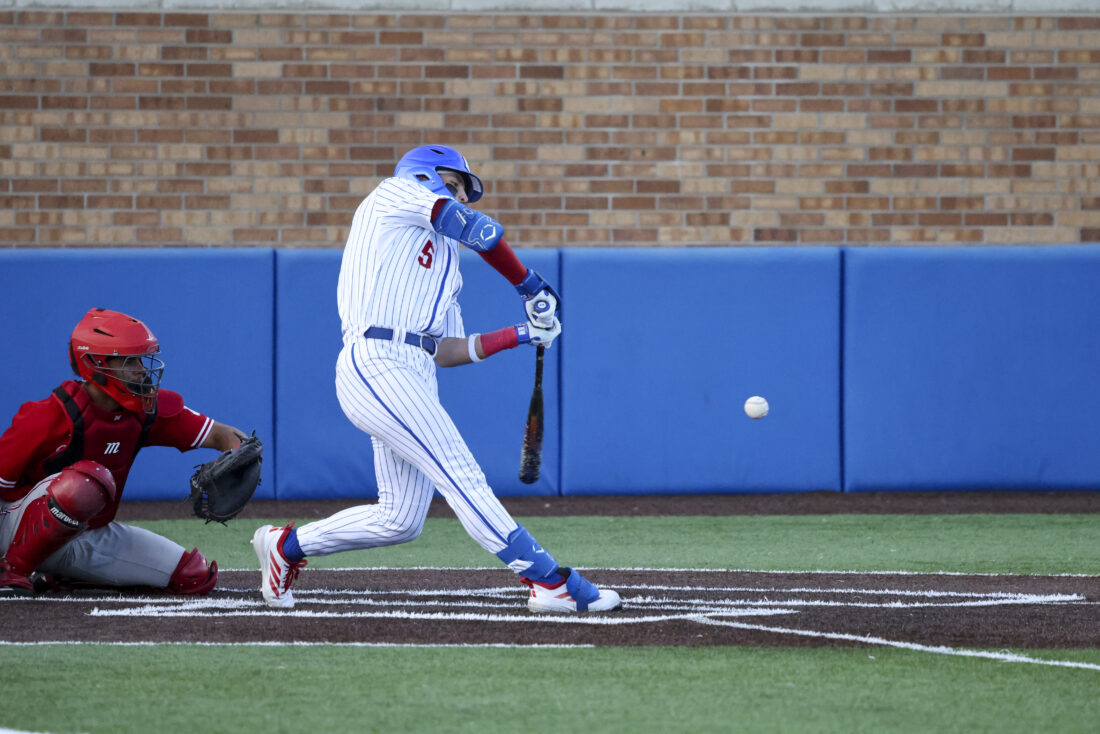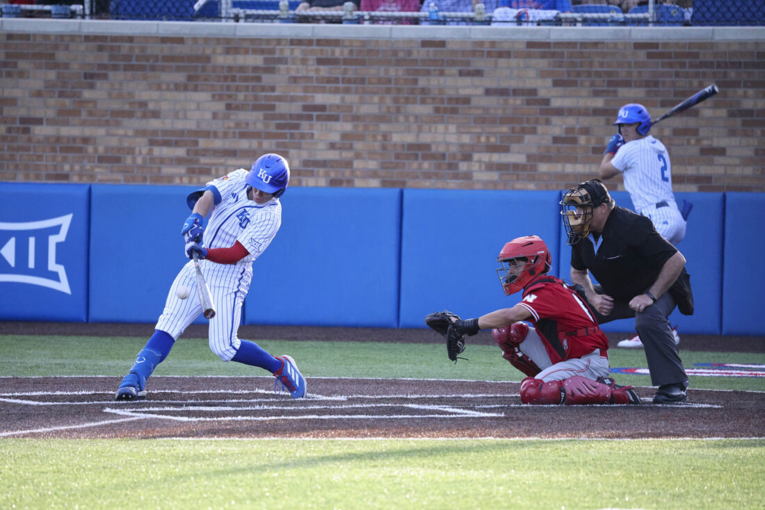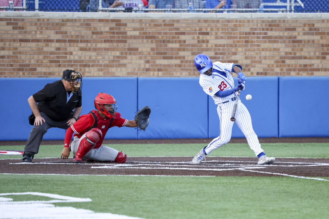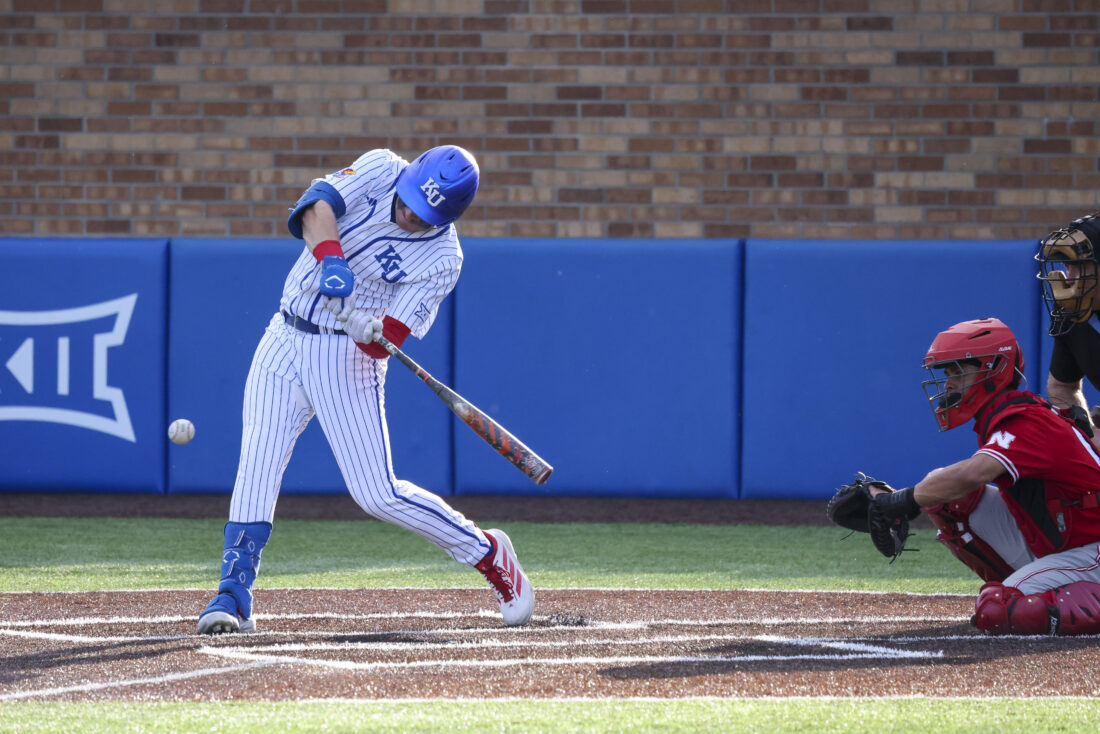 Kansas junior Cade Baldridge makes contact during the Jayhawks’ game against Nebraska on Tuesday, April 21, 2026, at Hoglund Ballpark in Lawrence.