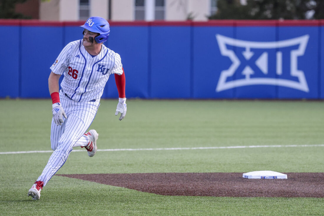 Kansas sophomore Tyson Owens rounds first after hitting a single in the Jayhawks’ game against Nebraska on Tuesday, April 21, 2026, at Hoglund Ballpark in Lawrence.