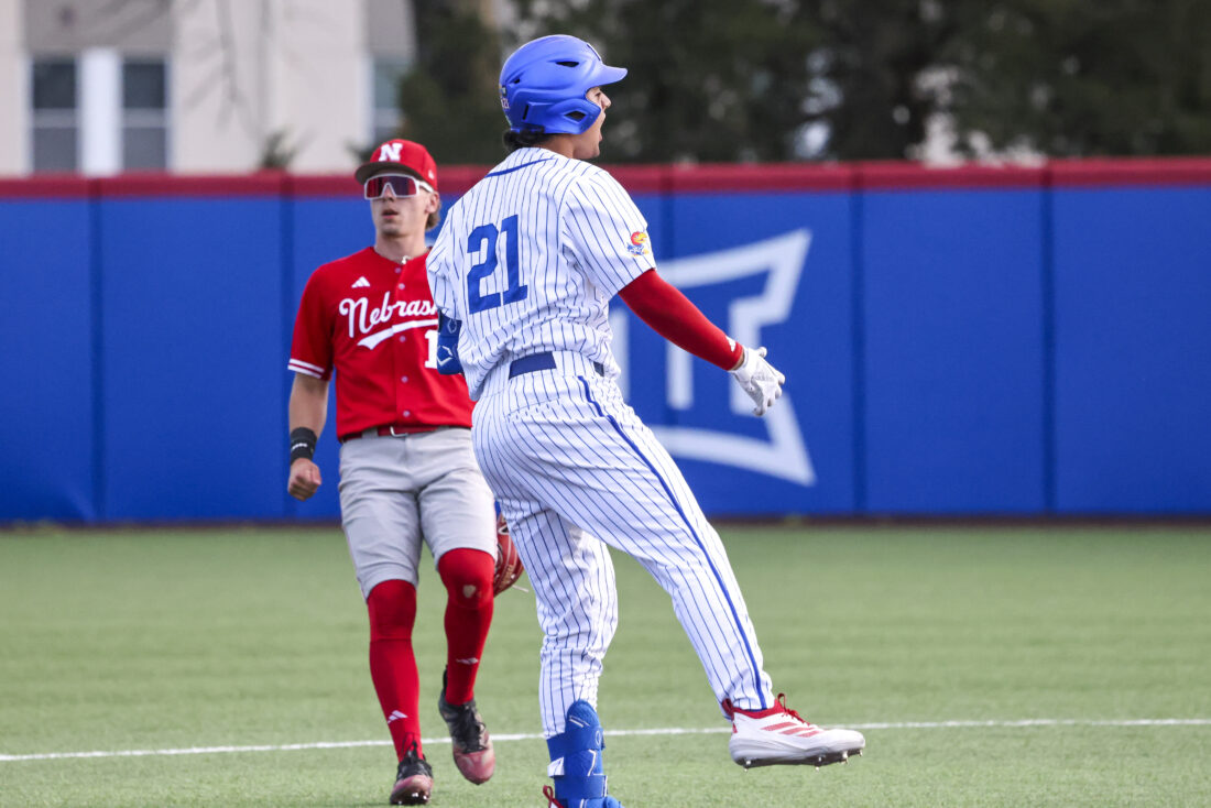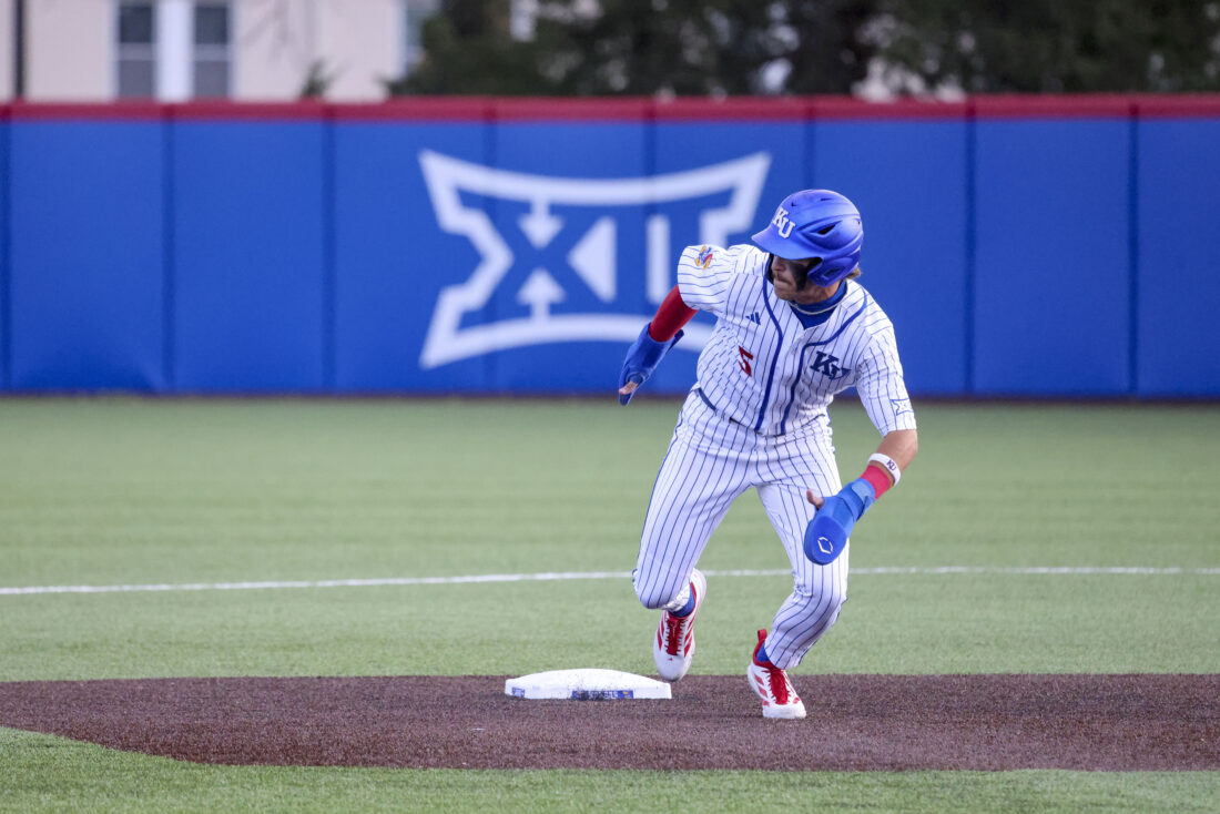 Kansas junior Brady Ballinger looks to the outfield as he rounds second base during the Jayhawks’ game against Nebraska on Tuesday, April 21, 2026, at Hoglund Ballpark in Lawrence.