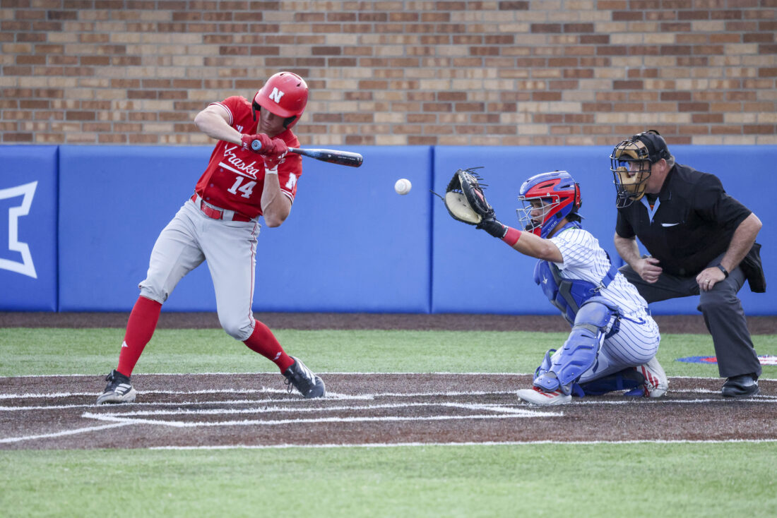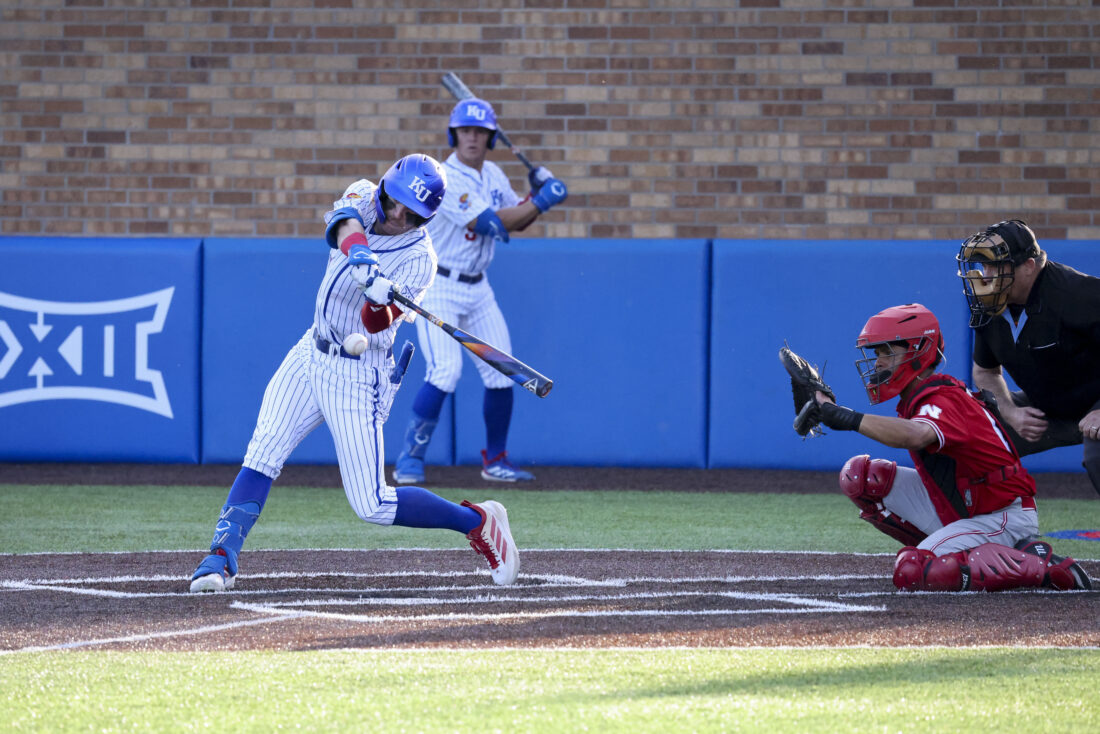 Kansas junior Brady Ballinger lines his barrel up with a Nebraska pitch during the Jayhawks’ game on Tuesday, April 21, 2026, at Hoglund Ballpark in Lawrence.