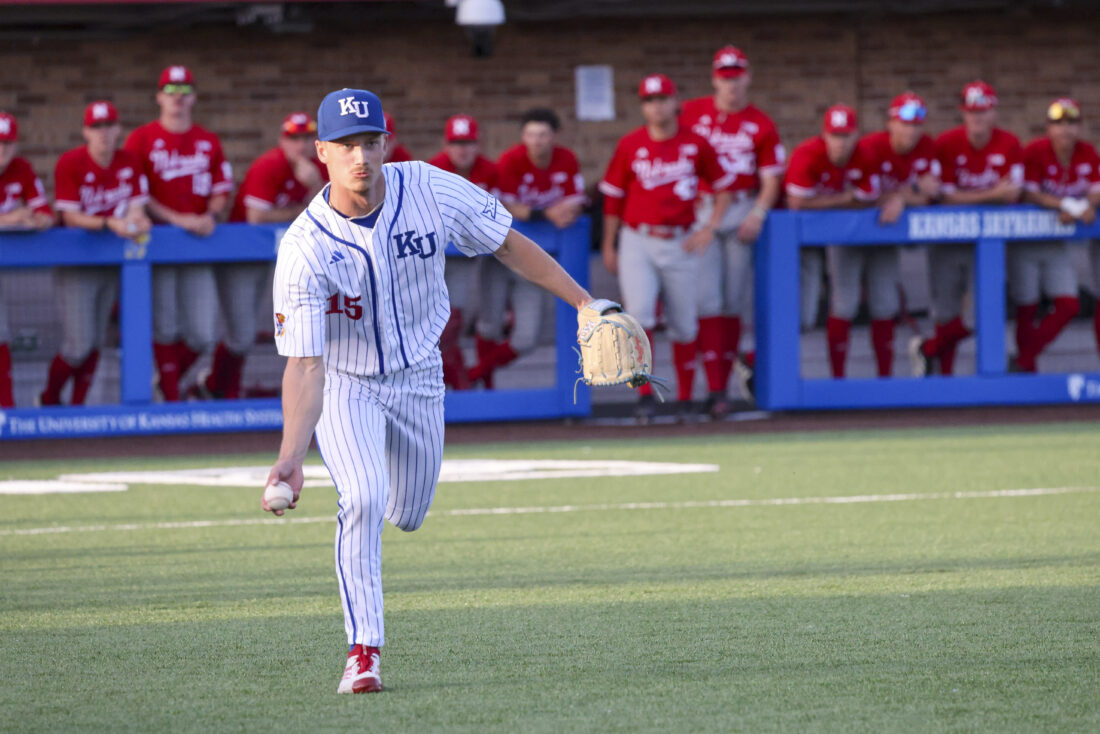 Kansas pitcher Toby Scheidt tosses the ball to first after fielding a ground ball during the Jayhawks’ game against Nebraska on Tuesday, April 21, 2026, at Hoglund Ballpark in Lawrence.