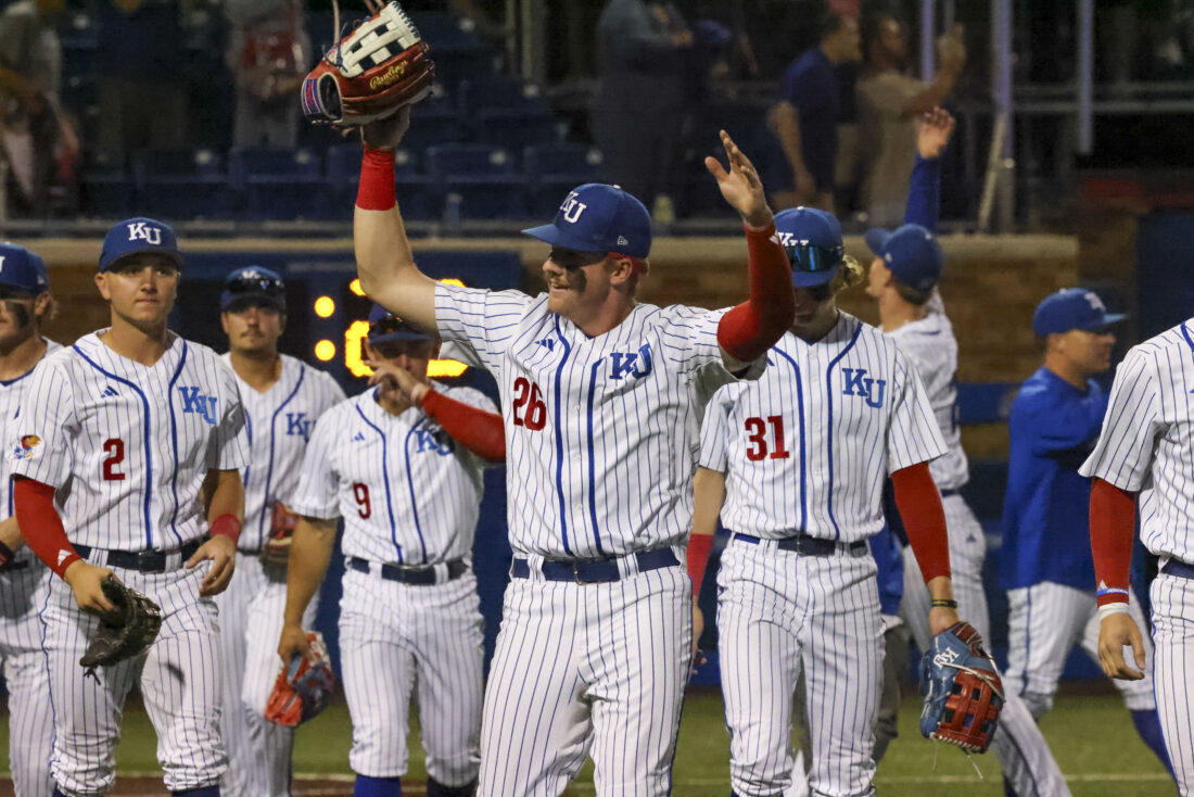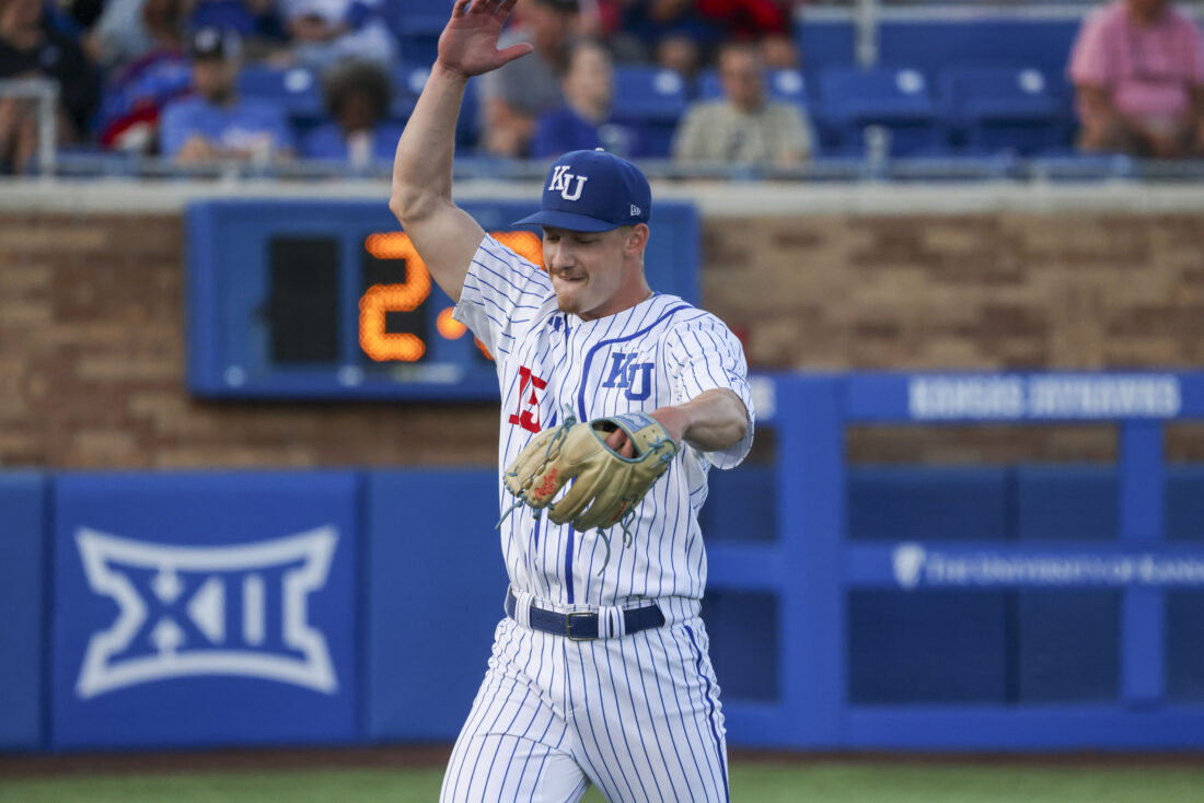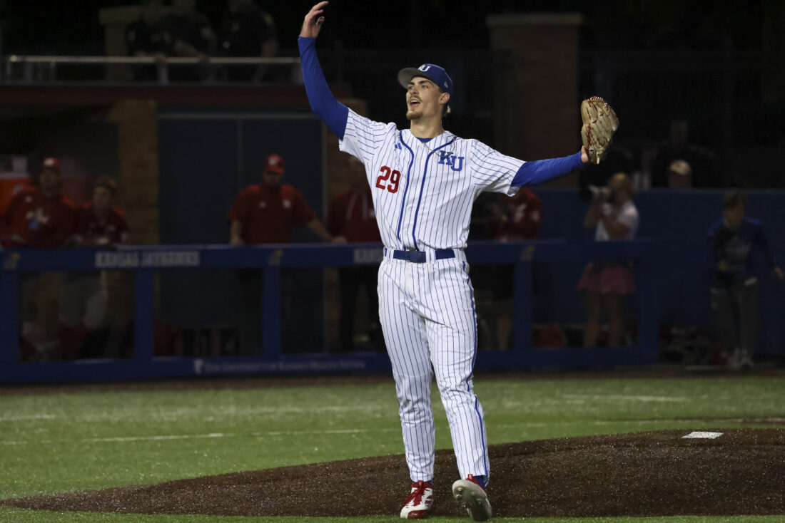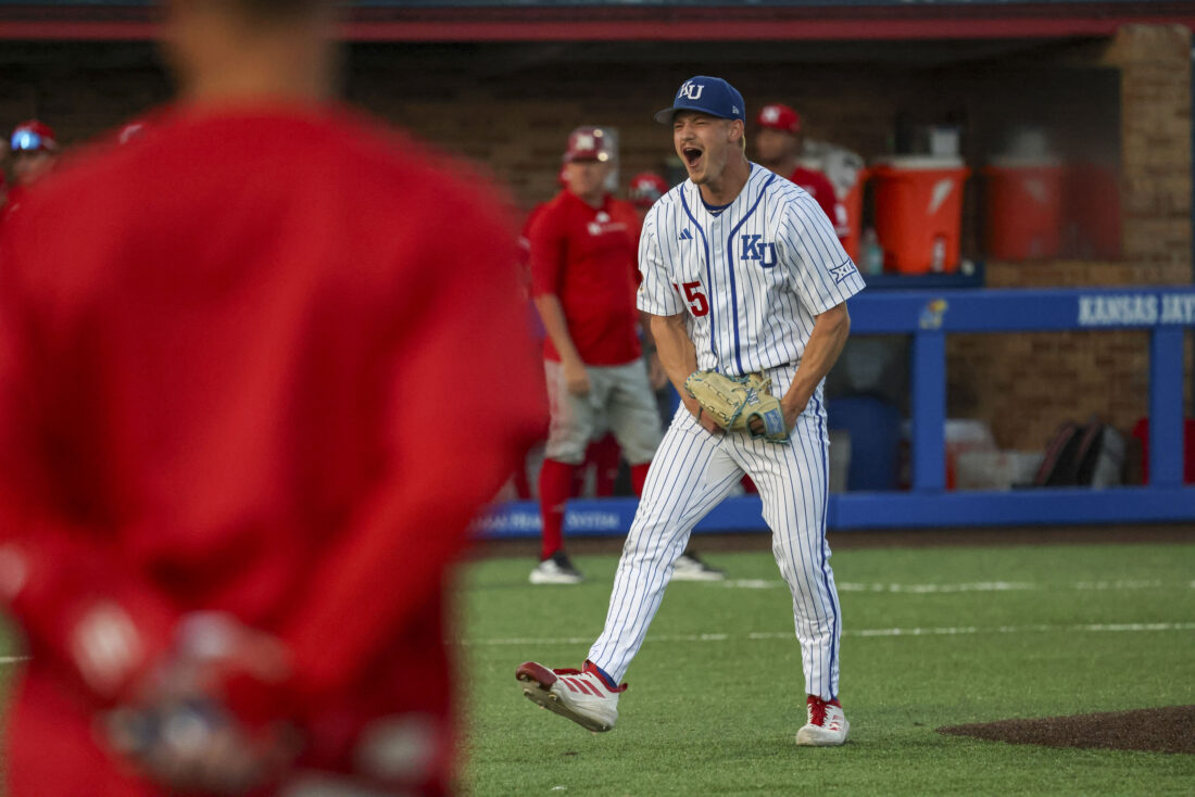 Kansas pitcher Boede Rahe celebrates after earning the final outs of the Jayhawks’ win over Nebraska on Tuesday, April 21, 2026, in Lawrence.