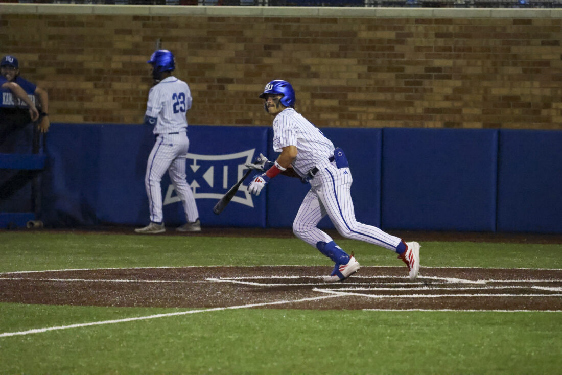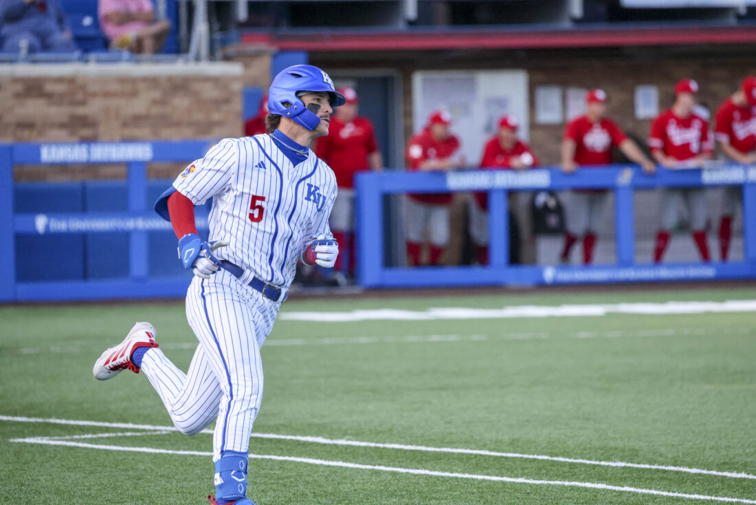 Kansas sophomore Tyson Owens sprints out of the batter’s box during the Jayhawks’ game against Nebraska on Tuesday, April 21, 2026, at Hoglund Ballpark in Lawrence.