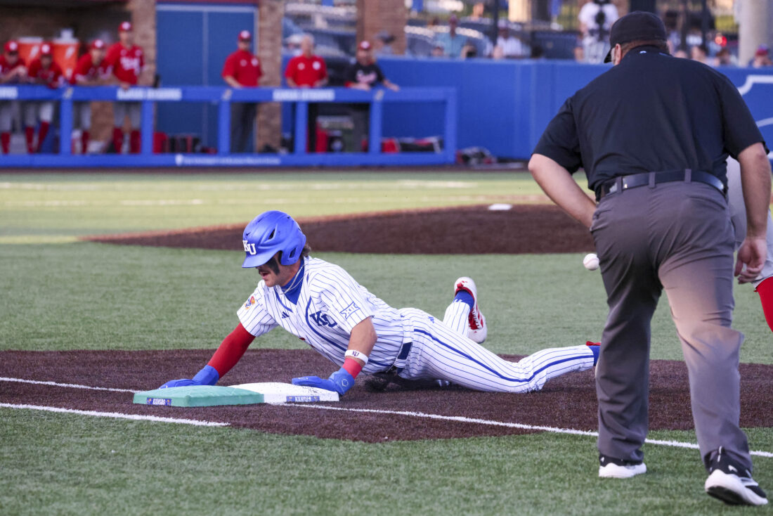 Kansas sophomore Tyson Owens dives safely back to first during the Jayhawks’ game against Nebraska on Tuesday, April 21, 2026, at Hoglund Ballpark in Lawrence.