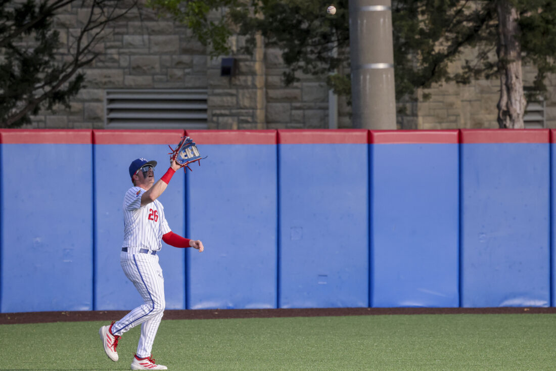Kansas left fielder Brady Ballinger tracks down a ball in the outfield during the Jayhawks’ game against Nebraska on Tuesday, April 21, 2026, at Hoglund Ballpark in Lawrence.