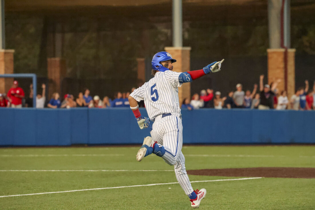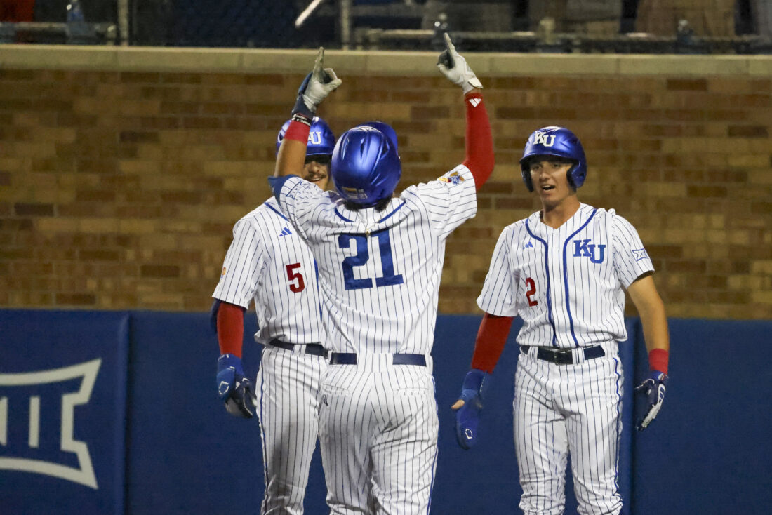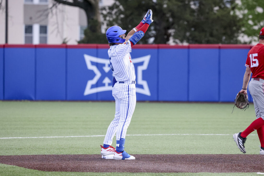 Kansas junior Brady Balllinger celebrates after the Jayhawks’ win over Nebraska on Tuesday, April 21, 2026, at Hoglund Ballpark in Lawrence.