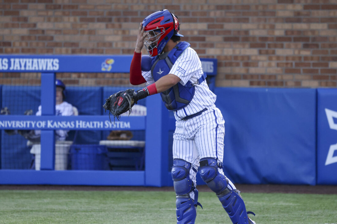 Kansas catcher Augusto Mungarrieta watches in a pitch during the Jayhawks’ game against Nebraska on Tuesday, April 21, 2026, at Hoglund Ballpark in Lawrence.