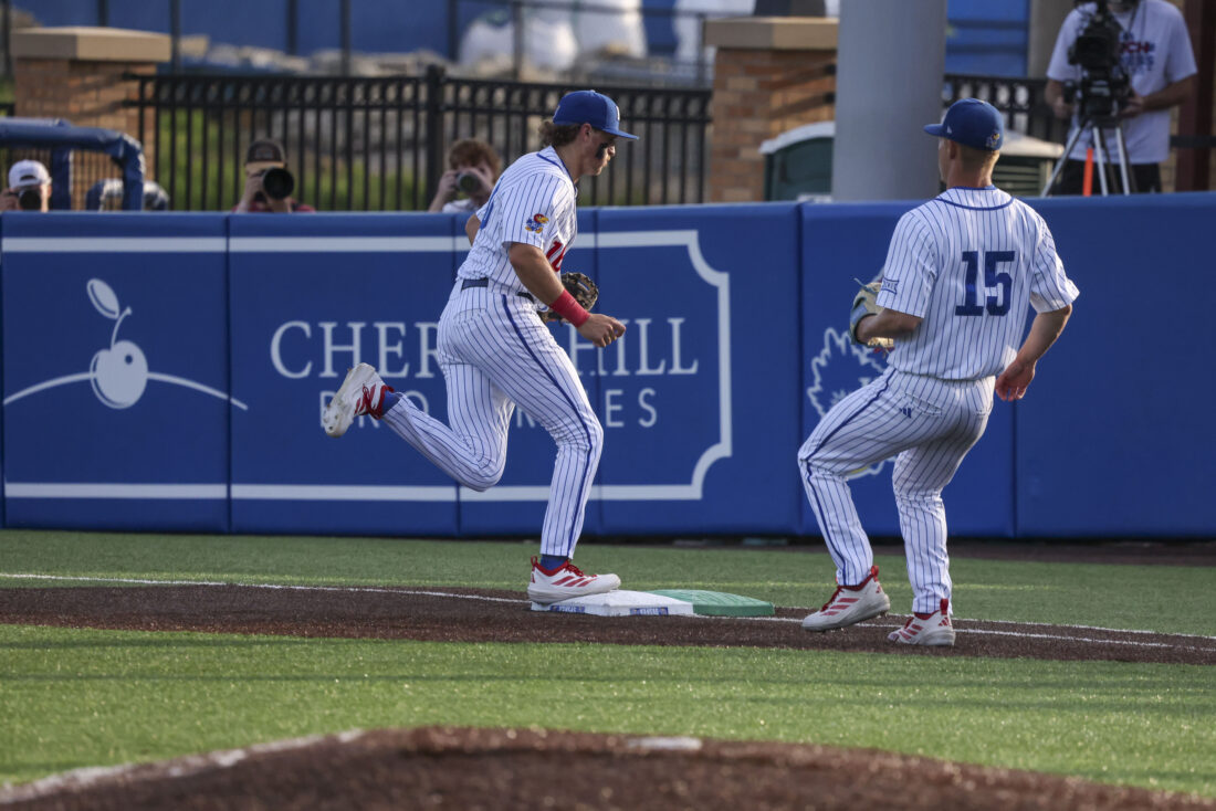 Kansas first baseman Josh Dykhoff (left) records an out as pitcher Toby Scheidt helps cover first during the Jayhawks’ game against Nebraska on Tuesday, April 21, 2026, at Hoglund Ballpark in Lawrence.