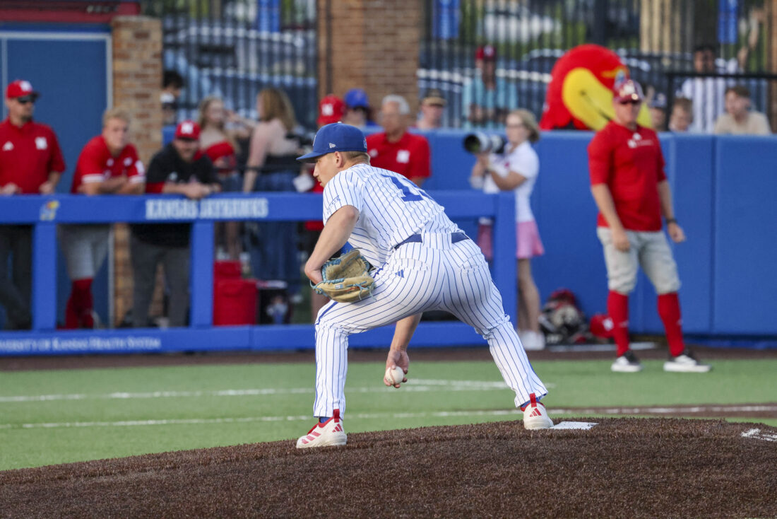 Kansas pitcher Kannon Carr winds up to pitch during the Jayhawks’ game against Nebraska on Tuesday, April 21, 2026, at Hoglund Ballpark in Lawrence.
