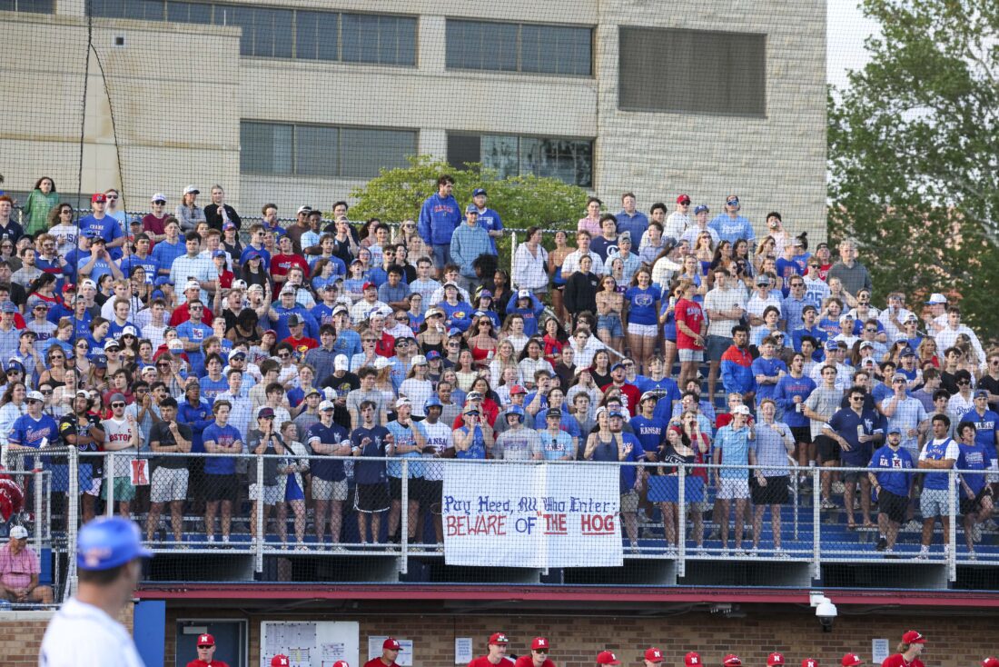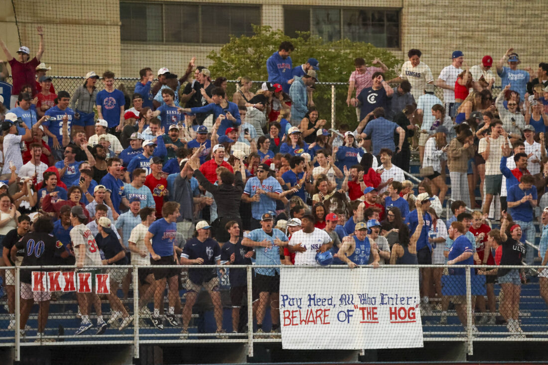 The Kansas student section cheers during the Jayhawks’ game against Nebraska on Tuesday, April 21, 2026, at Hoglund Ballpark in Lawrence.