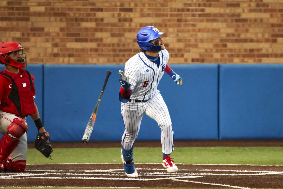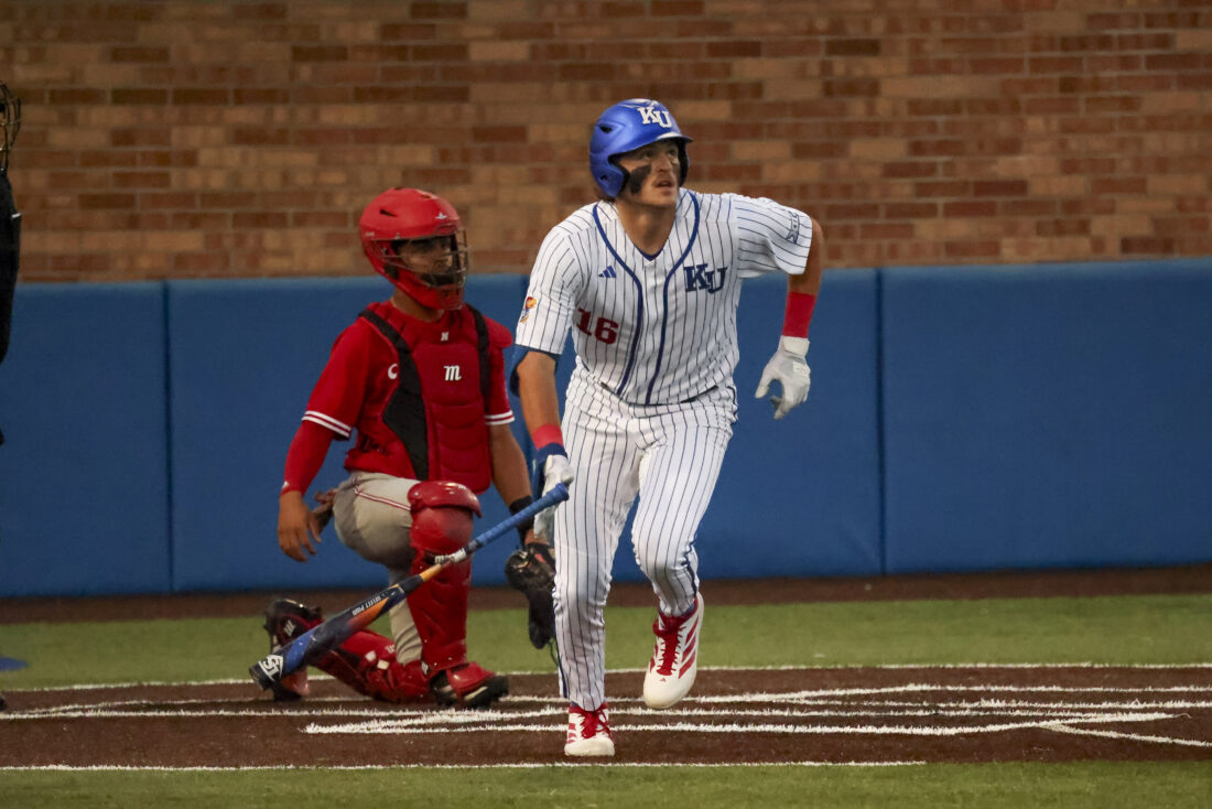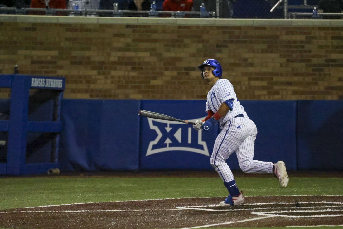 Kansas senior Josh Dykhoff watches his hit travel out of the park for a home run during the Jayhawks’ game against Nebraska on Tuesday, April 21, 2026, at Hoglund Ballpark in Lawrence.
