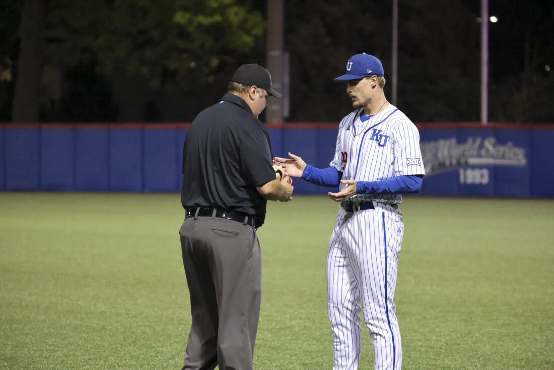 Kansas pitcher Boede Rahe is checked by an umpire before entering the the Jayhawks’ game against Nebraska on Tuesday, April 21, 2026, at Hoglund Ballpark in Lawrence.