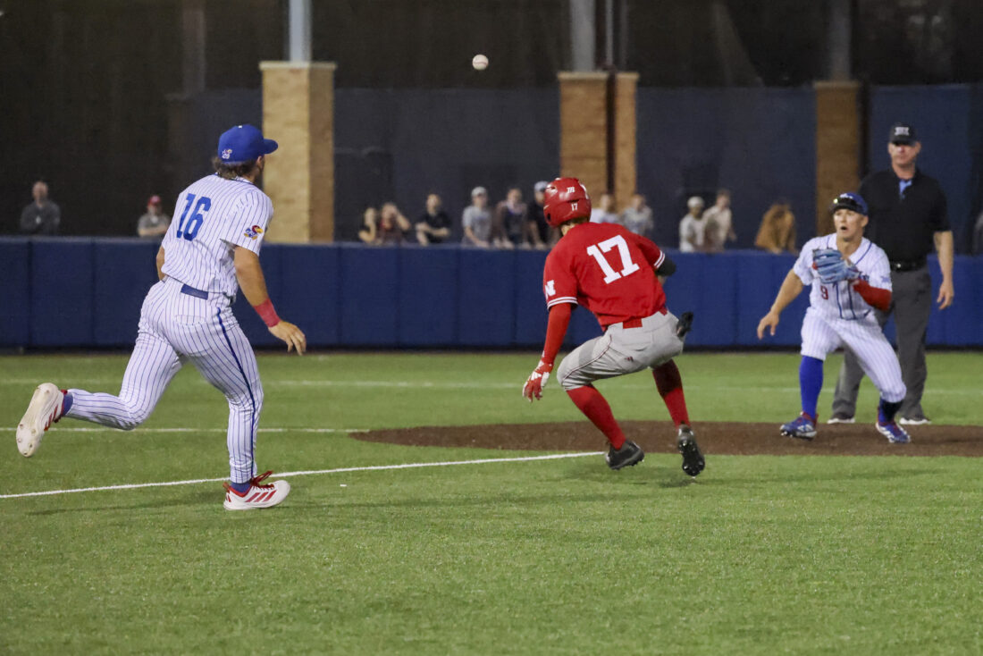 Kansas first baseman Josh Dykhoff (16) and second baseman Cade Baldridge get Nebraska’s Mac Moyer into a pickle during the Jayhawks’ game on Tuesday, April 21, 2026, at Hoglund Ballpark in Lawrence.