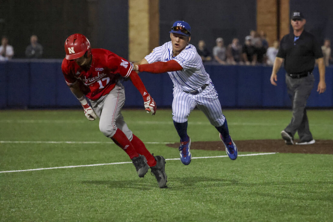 Kansas third baseman Dylan Schlotterback puts a tag on Nebraska’s Joshua Overbeek during the Jayhawks’ game on Tuesday, April 21, 2026, at Hoglund Ballpark in Lawrence.