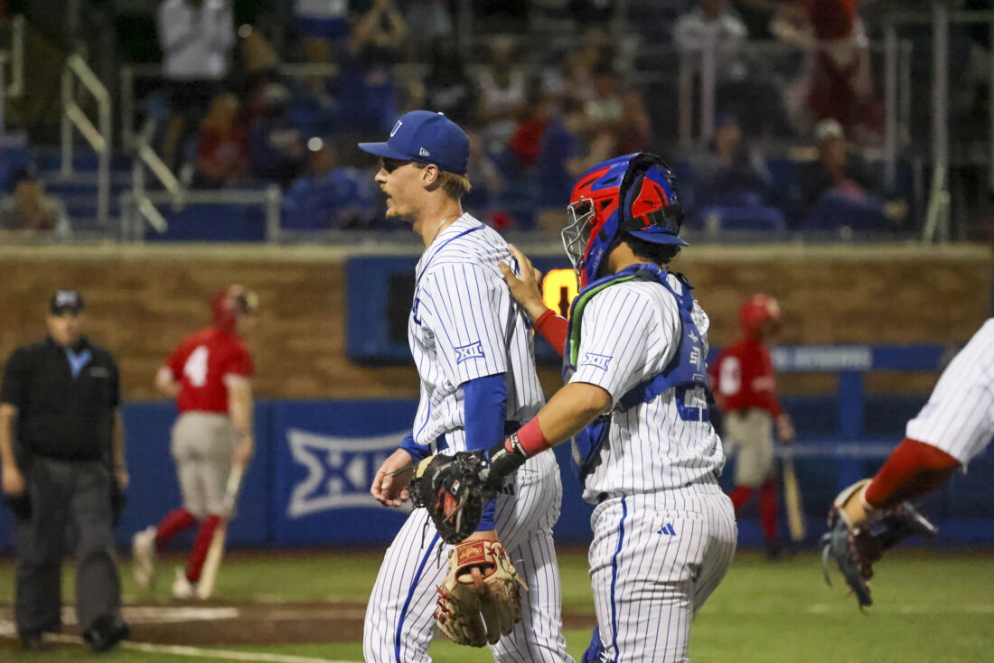 Kansas pitcher Boede Rahe (left) is congratulated by catcher Augusto Mungarrieta after closing out an inning during the Jayhawks’ game against Nebraska on Tuesday, April 21, 2026, at Hoglund Ballpark in Lawrence.