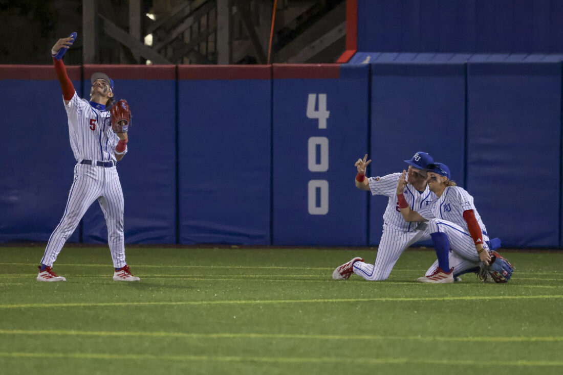 Kansas center fielder Tyson Owens takes a selfie with teammates Brady Ballinger, second from right, and Jordan Bach, right, after the Jayhawks’ win over Nebraska on Tuesday, April 21, 2026, in Lawrence.