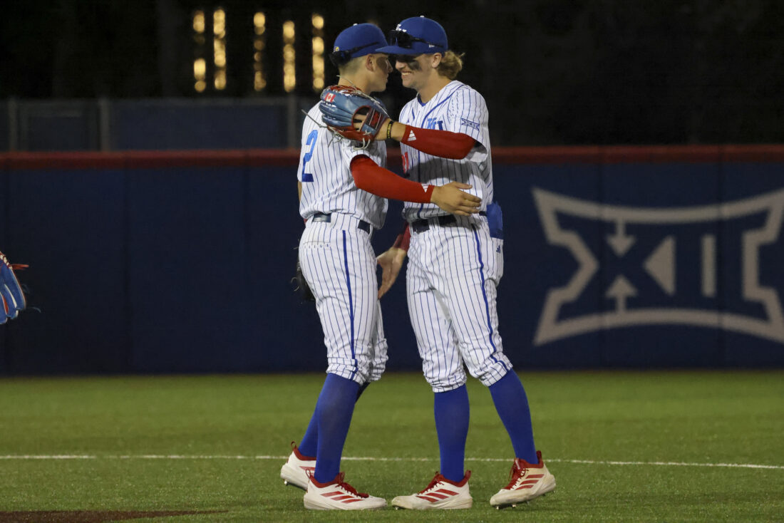 Kansas short stop Tyson LeBlanc (left) and right fielder Jordan Bach hug after the Jayhawks’ win over Nebraska on Tuesday, April 21, 2026, at Hoglund Ballpark in Lawrence.