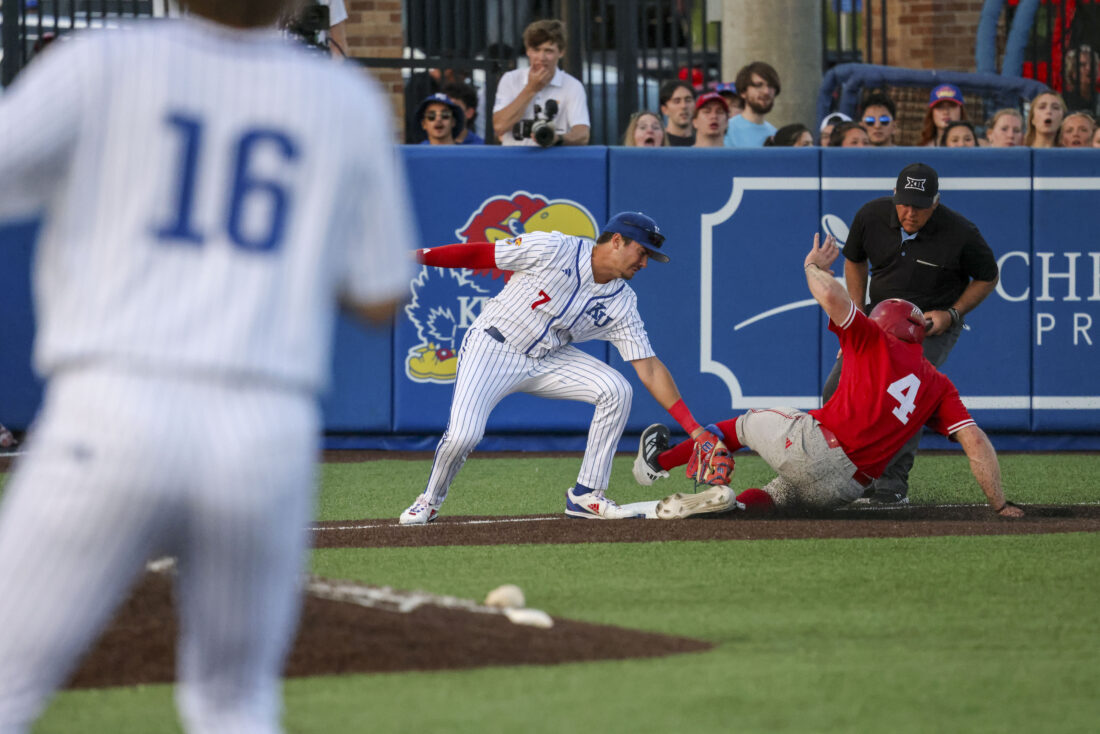 Kansas second baseman Cade Baldridge tags out Nebraska’s Mac Moyer during the Jayhawks’ game on Tuesday, April 21, 2026, at Hoglund Ballpark in Lawrence.