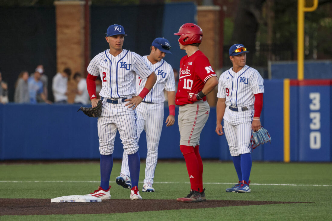 Kansas shortstop Tyson LeBlanc chats with Nebraska’s Drew Grego while a play is reviewed during the Jayhawks’ game on Tuesday, April 21, 2026, at Hoglund Ballpark in Lawrence.