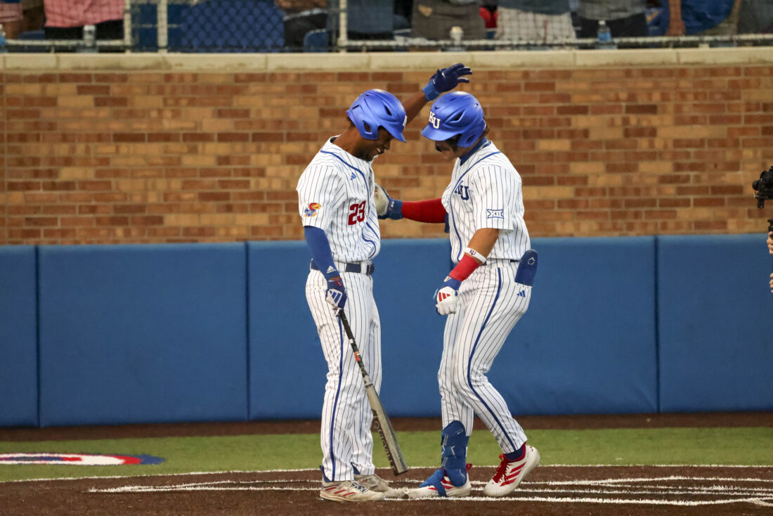Kansas senior Dariel Osoria celebrates with sophomore Tyson Owens during the Jayhawks’ game against Nebraska on Tuesday, April 21, 2026, at Hoglund Ballpark in Lawrence.