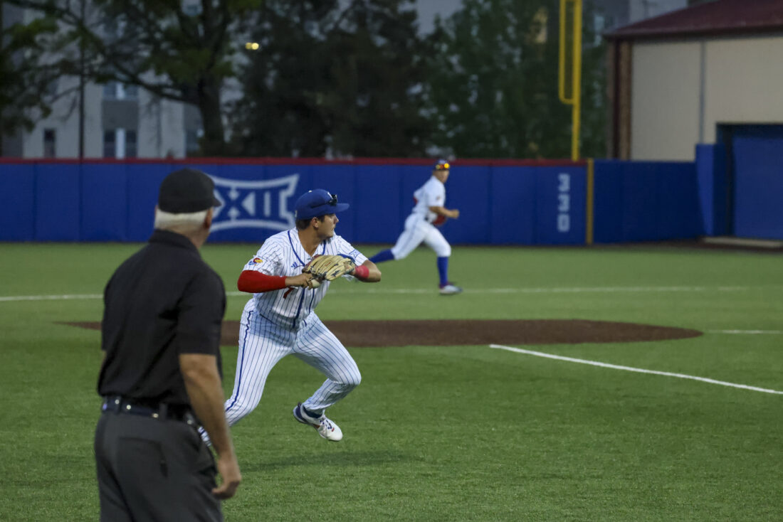 Kansas second baseman Cade Baldridge throws to first during the Jayhawks’ game against Nebraska on Tuesday, April 21, 2026, at Hoglund Ballpark in Lawrence.