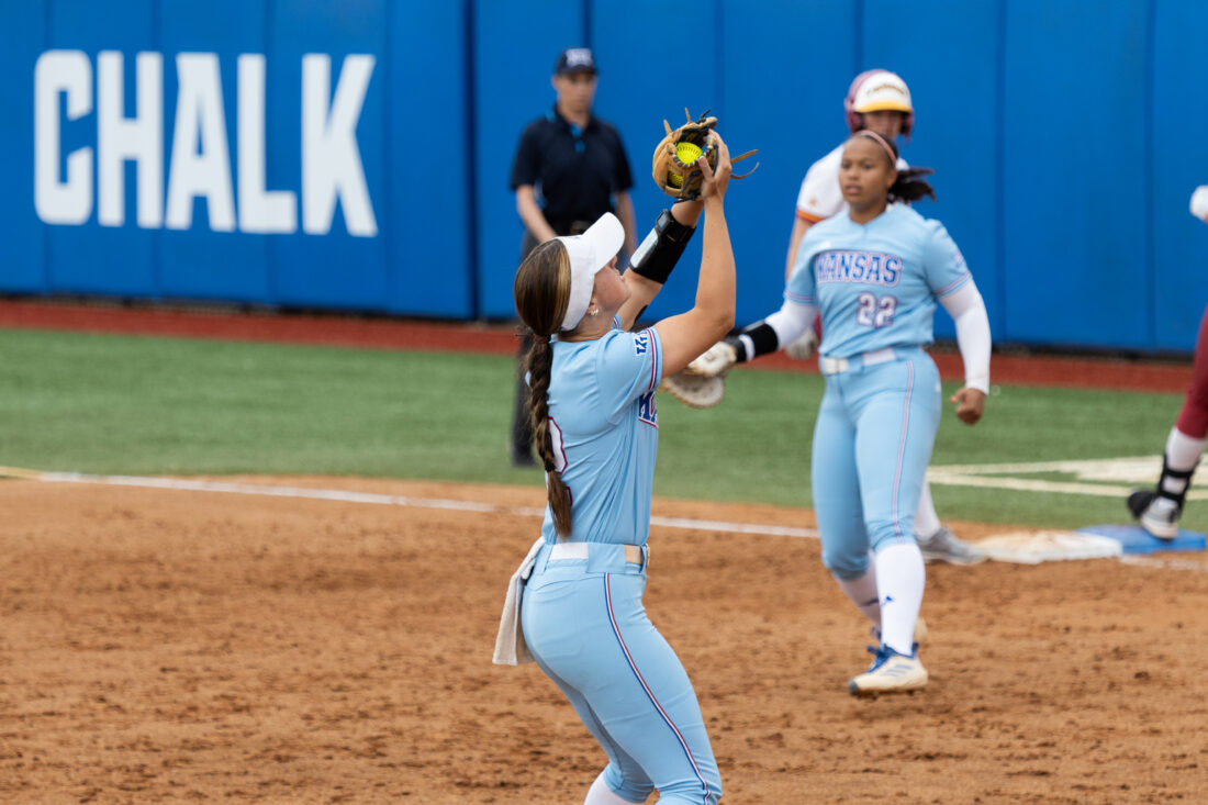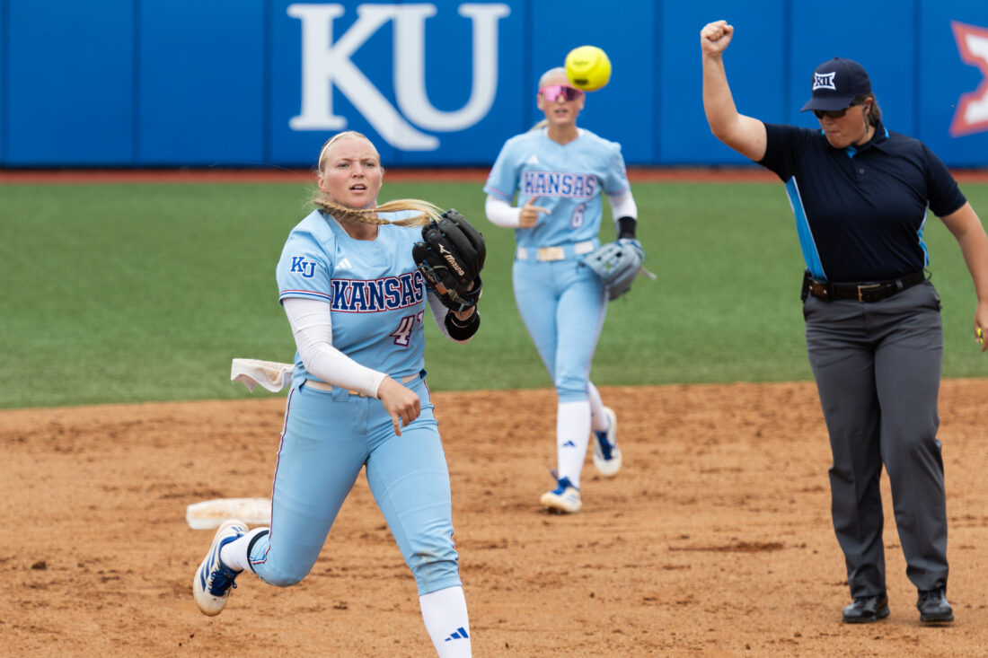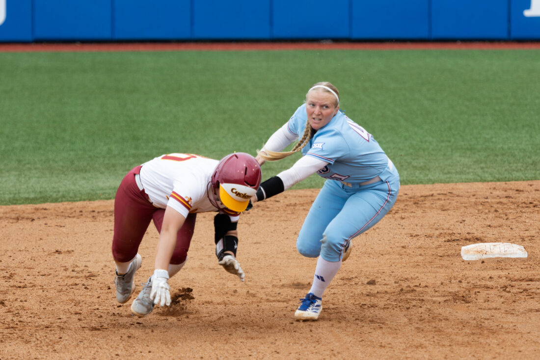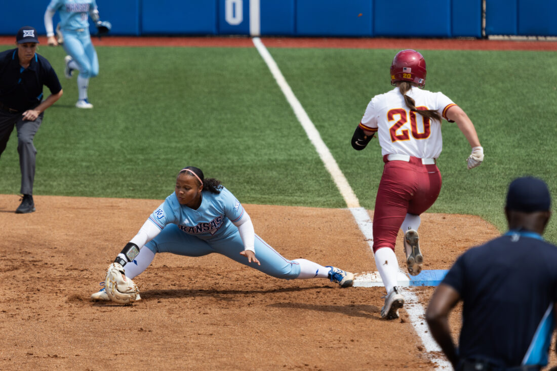 Kansas’ Hailey Cripe gets an out against Iowa State on Saturday, April 25, 2026, in Lawrence.