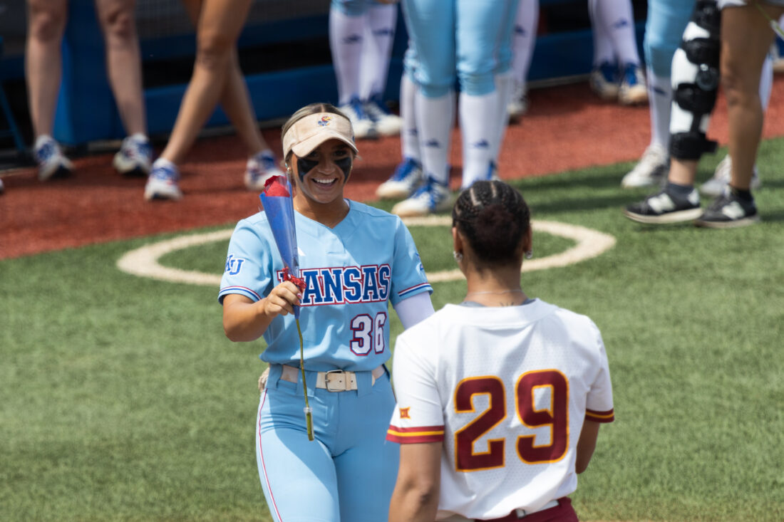 Kansas’ Madi Hays gives a flower to Iowa State’s Tiana Poole for senior day before the start of the game against Iowa State on Saturday, April 25, 2026, in Lawrence.