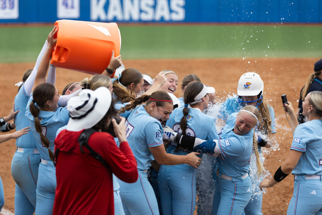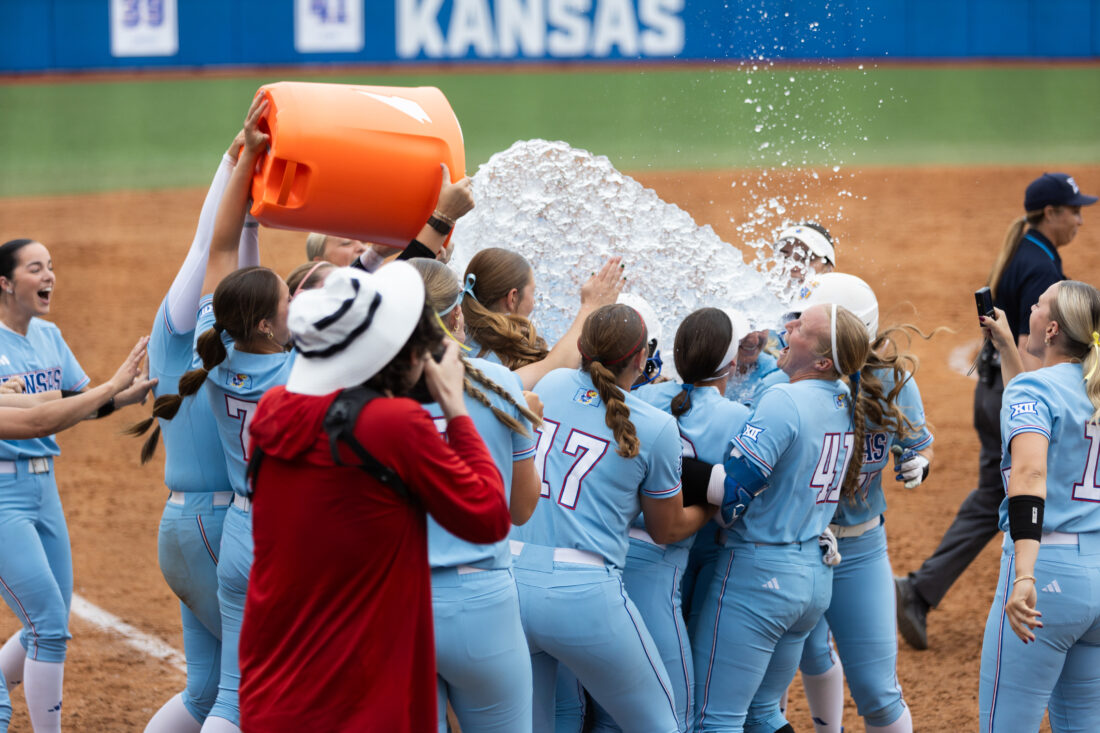 Kansas’ softball team celebrates Anna Soles hitting the game-winning home run against Iowa State on Saturday, April 25, 2026, in Lawrence.