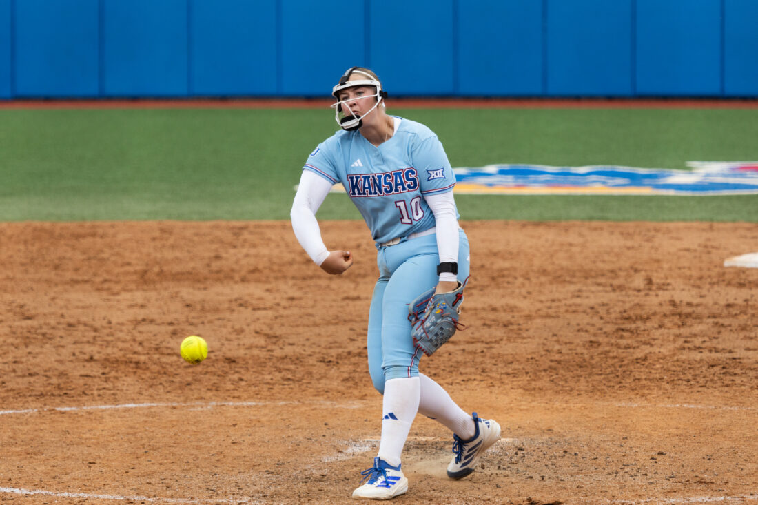 Kansas’ Lila Partridge pitches the ball against Iowa State on Saturday, April 25, 2026, in Lawrence.