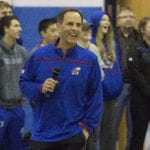Kansas University volleyball coach Ray Bechard flashes a big grin toward the crowd gathered in the Horejsi Center to welcome histeam back to Lawrence on Sunday.