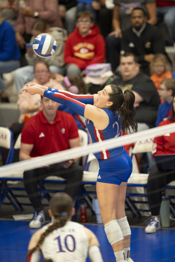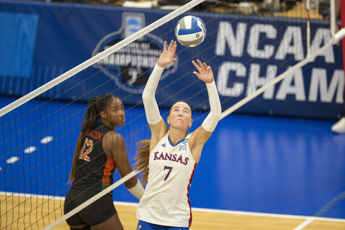 Kansas setter Katie Dalton sets the ball to a teammate against Miami in the second round of the NCAA Tournament in Horejsi Family Volleyball Arena on Friday, Dec. 5, 2025 in Lawrence.