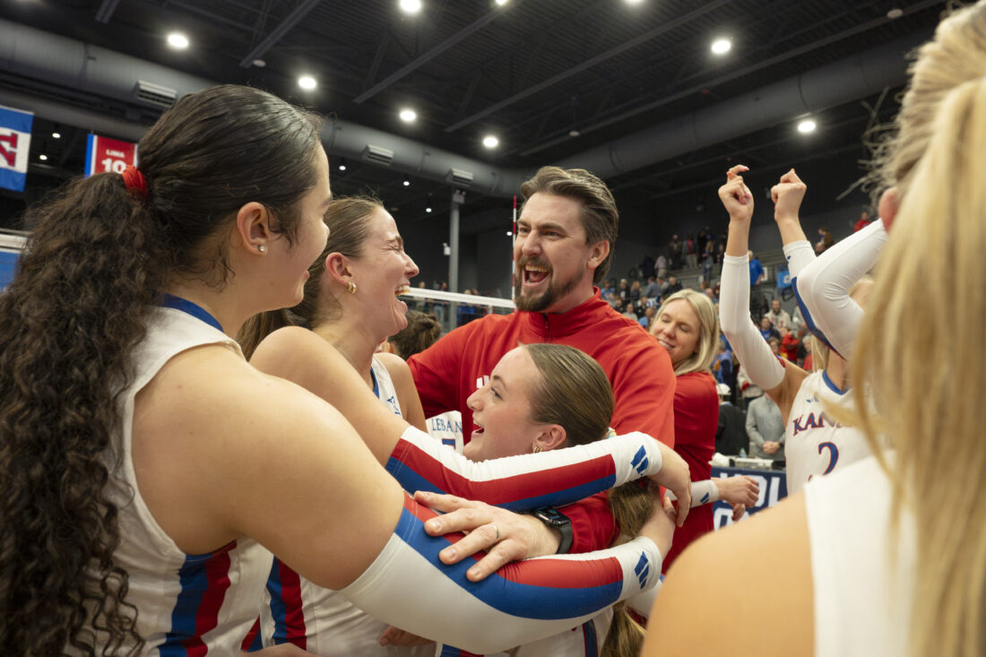 Kansas head coach Matt Ulmer celebrates with the team after defeating Miami in the second round of the NCAA Tournament in Horejsi Family Volleyball Arena on Friday, Dec. 5, 2025 in Lawrence.