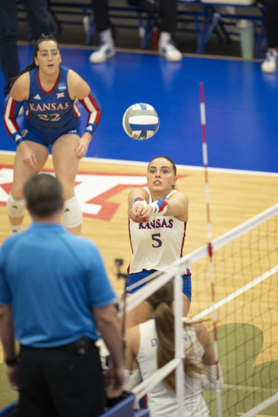 Kansas pin hitter Selena Leban bumps the ball to a teammate against Miami in the second round of the NCAA Division 1 Tournament in Horejsi Family Volleyball Arena on Friday, December 5, 2025 in Lawrence, Kansas.