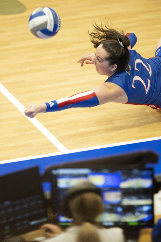 Kansas pin hitter Selena Leban goes to a knee for a dig against Miami in the second round of the NCAA Tournament in Horejsi Family Volleyball Arena on Friday, Dec. 5, 2025 in Lawrence.