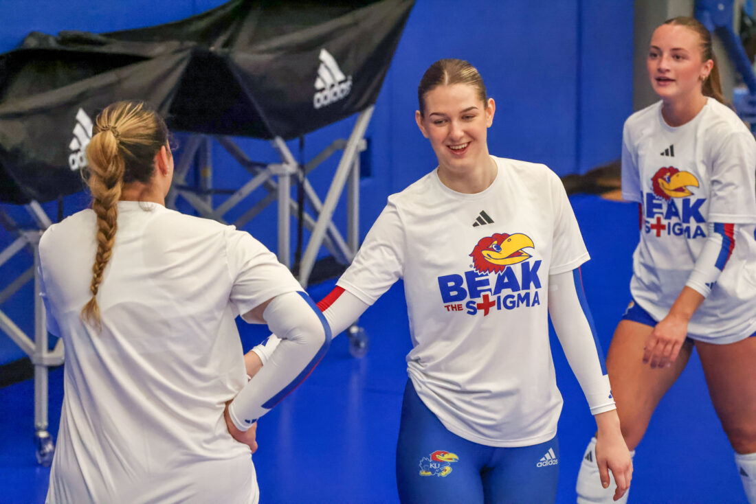 KU freshman Aurora Papac (center) high-fives teammate Jovana Zelenovic during warmups as the Jayhawks wear mental health awareness shirts prior to the match against Texas Tech on Wednesday, Oct. 8, 2025, at the Horejsi Family Volleyball Arena in Lawrence.